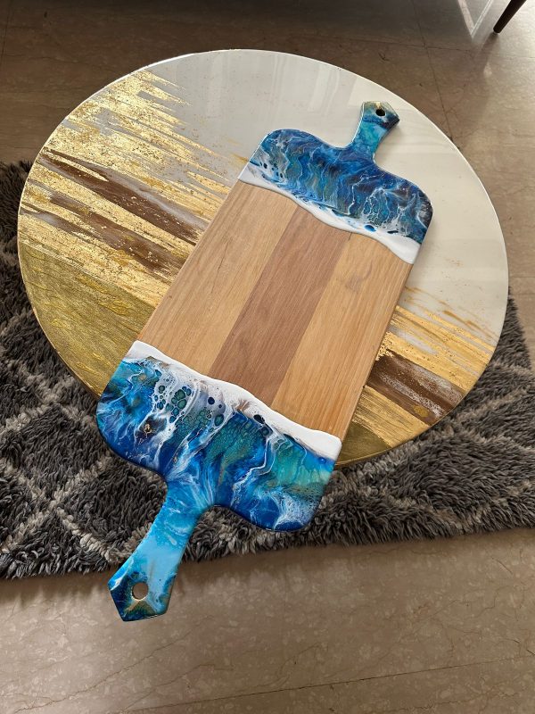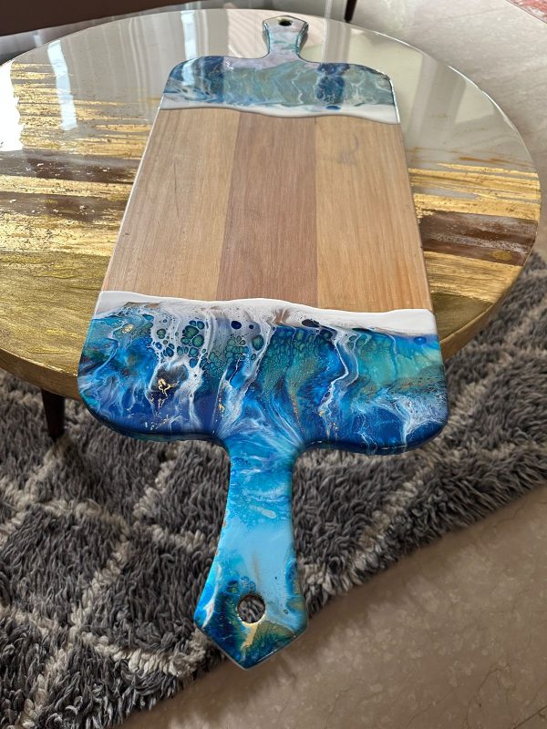This wood serving tray has a unique epoxy resin work in ocean blues! It has a unique larger size that can be used as a cheeseboard or even to serve brunch. One can also use as a centerpiece to add glamour to your food display. This serving platter also makes a unique gift item!