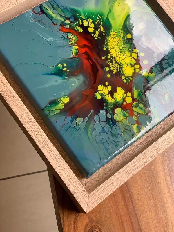 This acrylic painting is an abstract art in most unusual color combination of yellows, green, blues and red. The base is a grey blue color to provide contrast so focus is on the details. It’s beautifully framed in a light wood frame and this can be hung both ways, portrait or landscape. It has an epoxy resin finish on it which lends an unbelievable gloss and brings out the colors even more. It’s a modern statement piece that will brighten your interiors and at the same time blend in with most neutrals due to it’s beautiful rich colors.