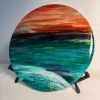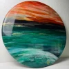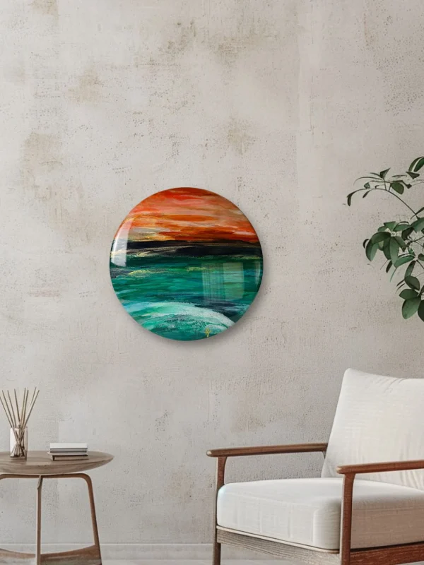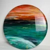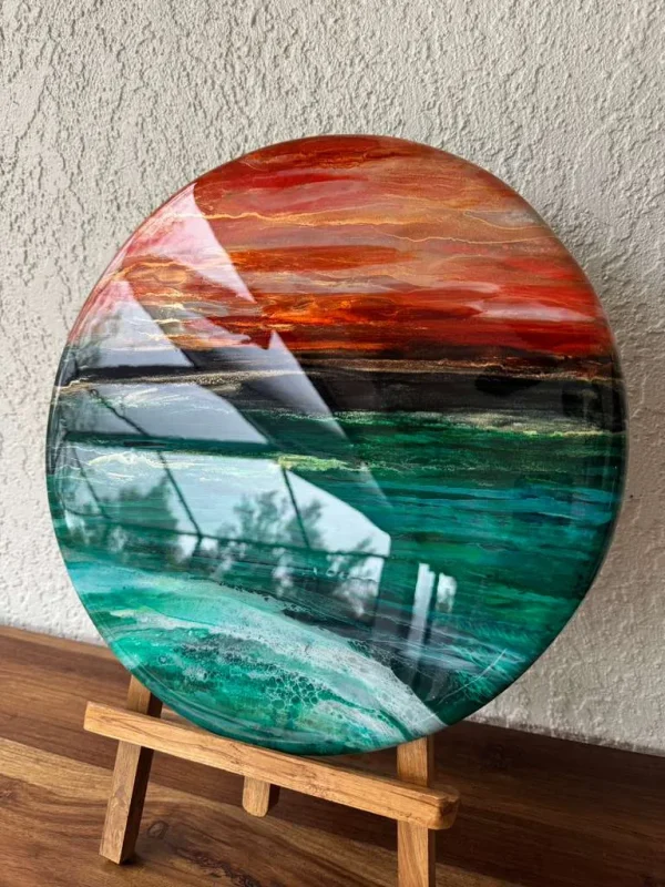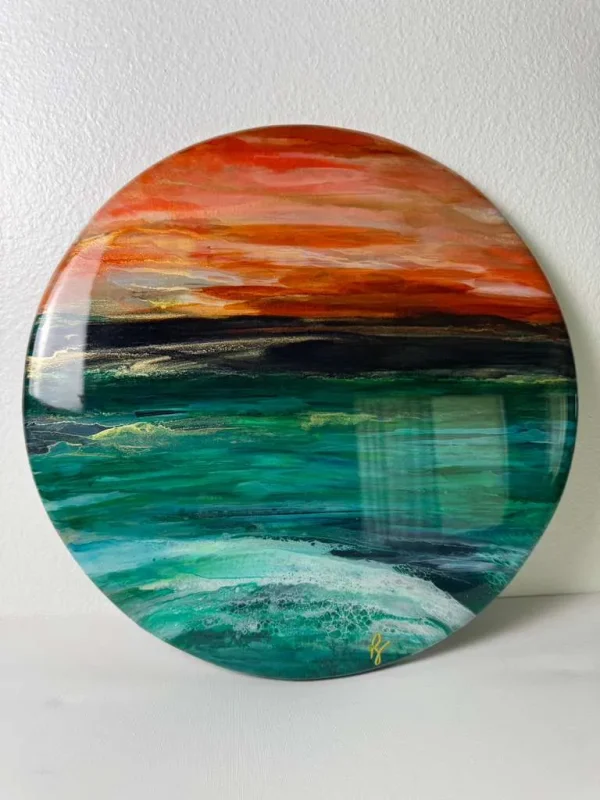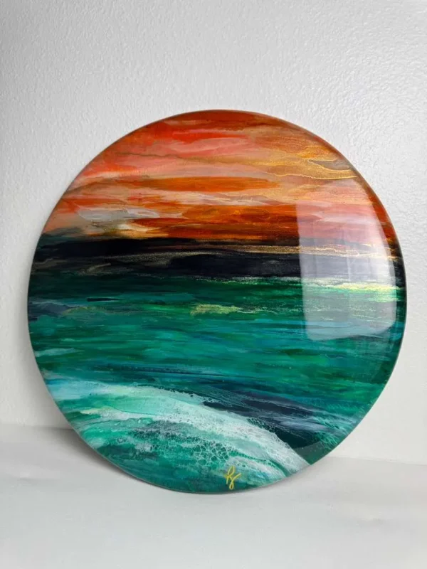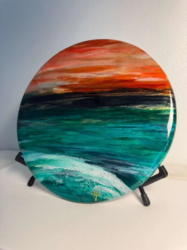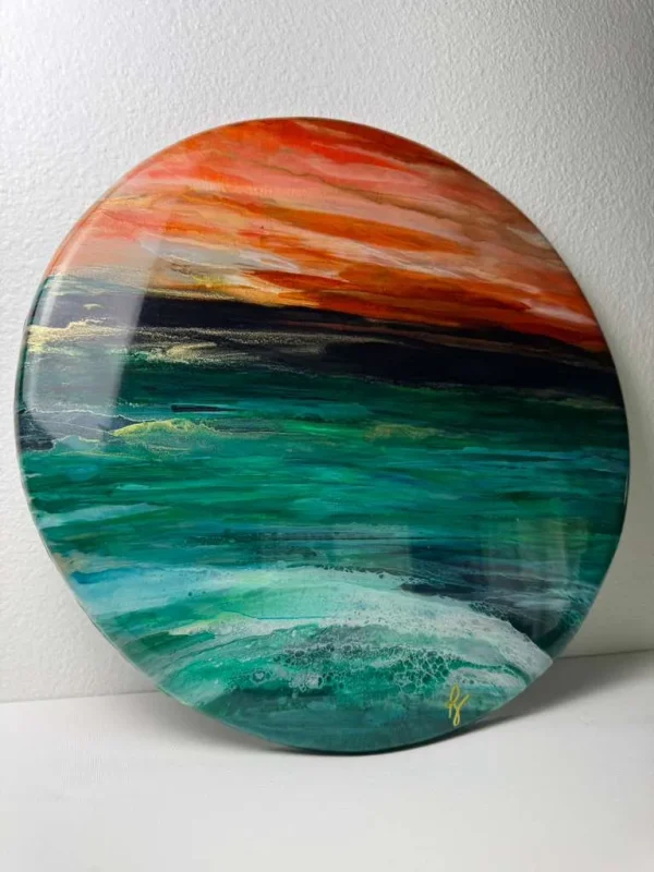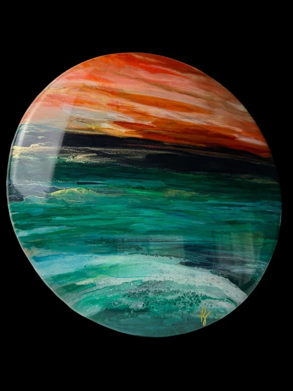By layering resin and alcohol inks, depth and movement in the ocean waves is cleverly created. The high gloss resin finish is contemporary and in alignment with art that is forward looking.