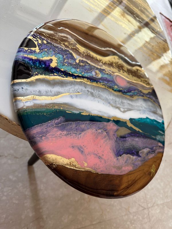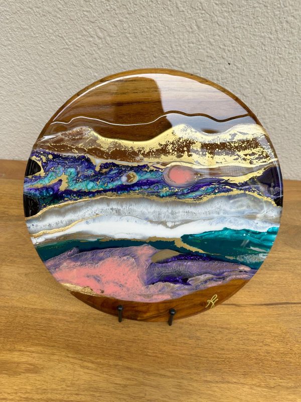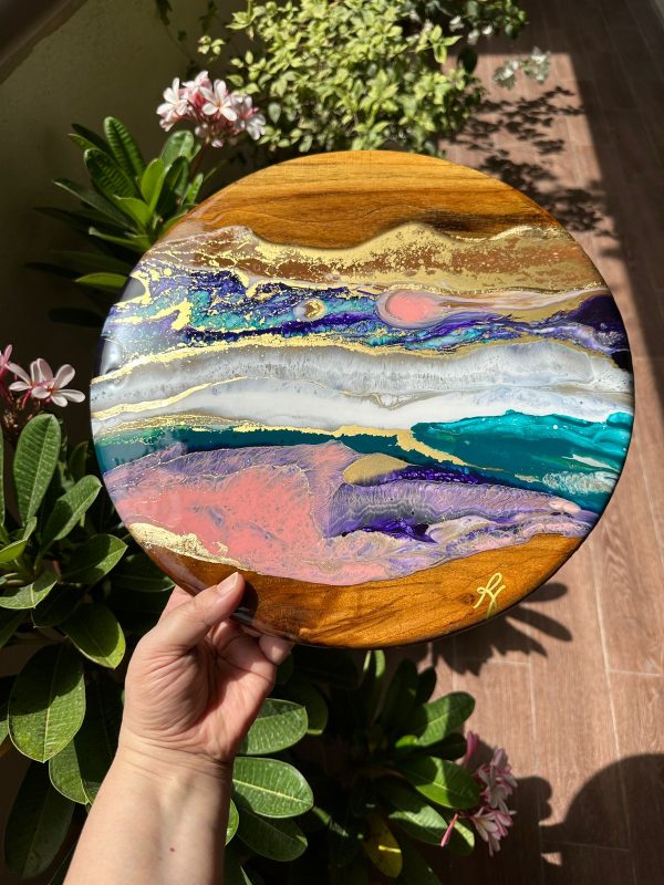 This beautiful wall art has a unique abstract landscape design of a mesmerizing scenery at sunset. This art is created with layers of pigmented resin finished with a final layer of clear Epoxy resin for extra shine. The details are achieved through a special art technique and is done in our signature style made with a lot of love and care and what we call a perfect conversational piece!