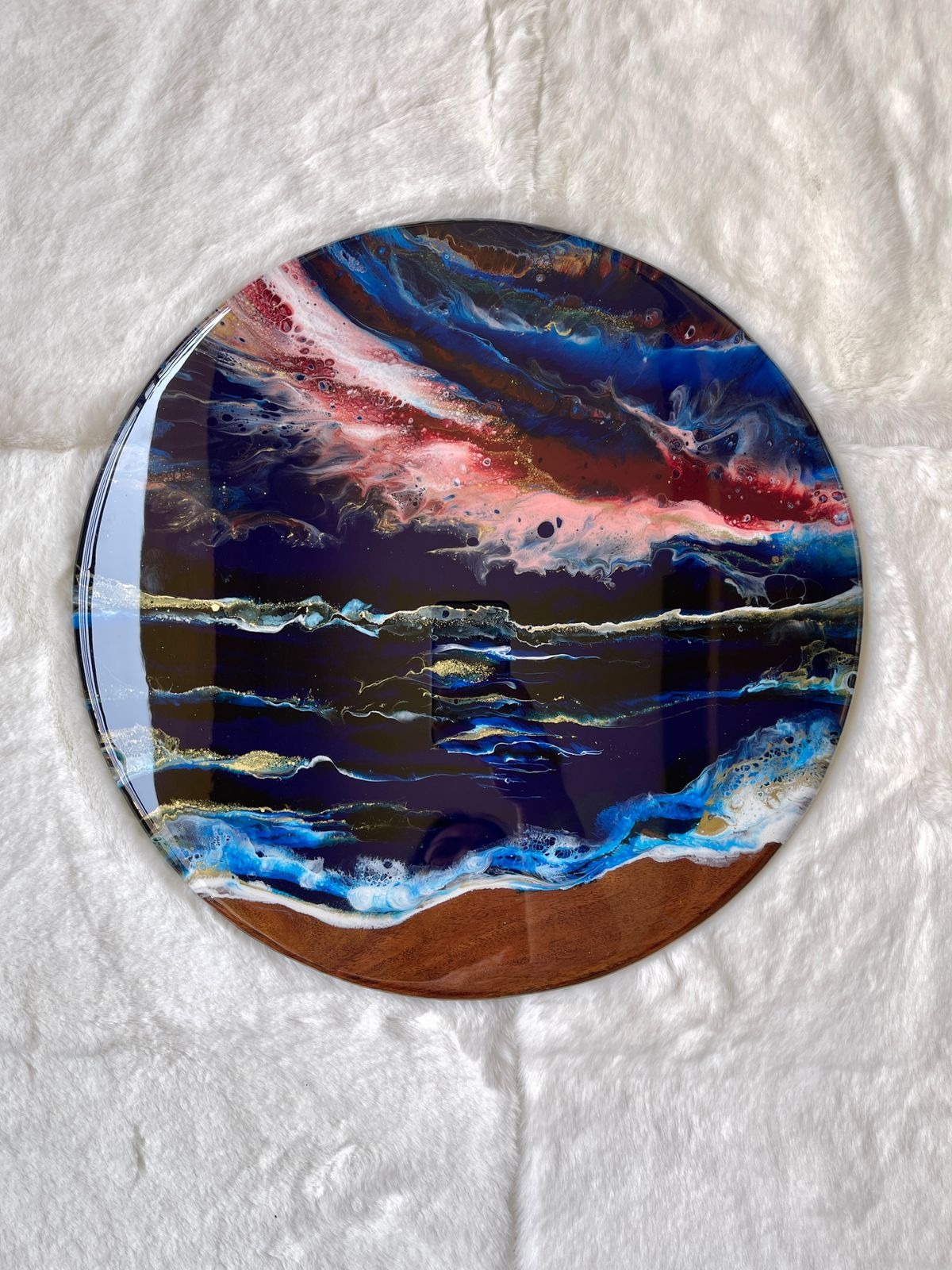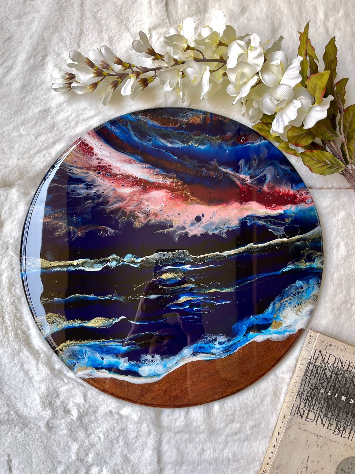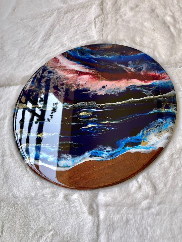 This epoxy resin wall art on a solid teak wood base has a unique abstract design of sky lit with the northern lights over the sea in various shades of pink, burgundy, blue, purple, white and gold! The details are achieved through a special art technique. This can also be used as a centerpiece to add glamour to your food display or as a decorative platter as it’s base is on solid wood and the resin used is food safe. It’s a versatile piece although we recommend it as a wall art!