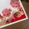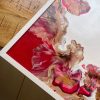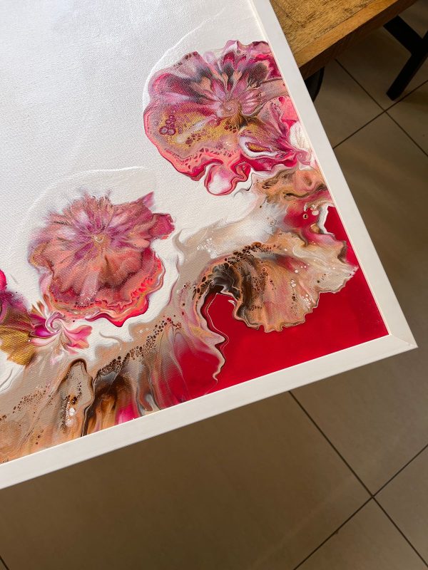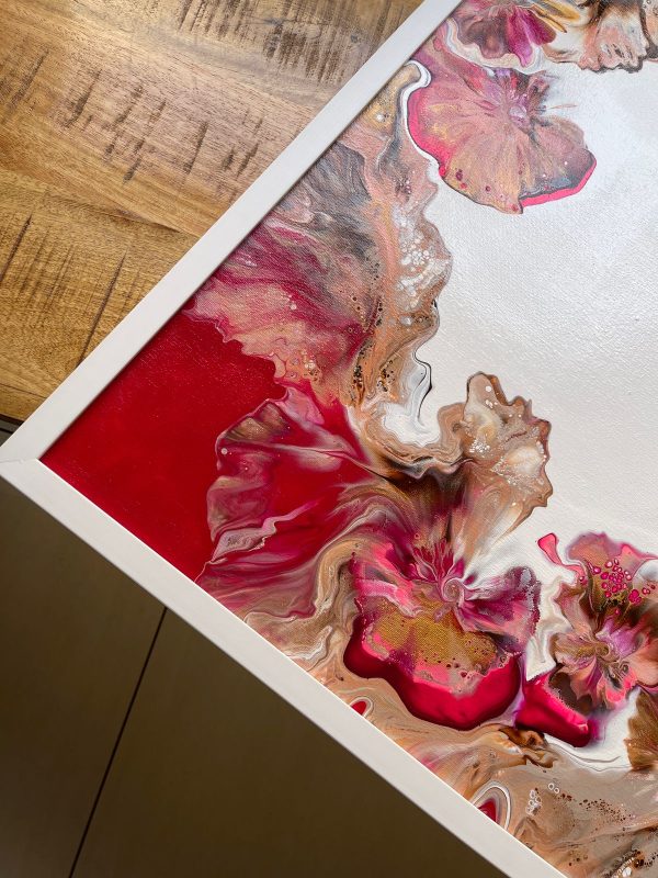 This acrylic painting is an abstract of nature changing colors in shades of brown, burgundy, pinks, violet, white and gold on a simple white background. It’s beautifully framed in white and this can be hung both ways. It’s a modern statement piece that will brighten your interiors and at the same time blend in due to the use of many colors.