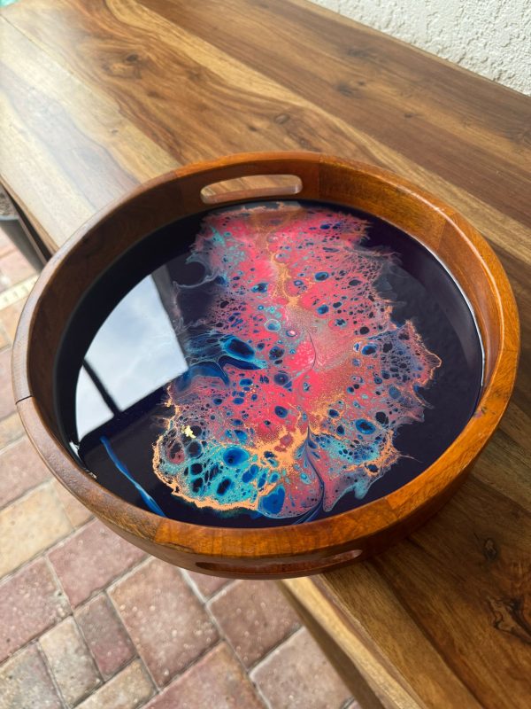 This epoxy resin tray has a unique abstract design in various shades of pink, blue white and striking gold! The details are achieved through a special art technique. This can be used as a serving/decorative platter as the resin used is food safe or to store items. It’s a versatile piece.