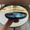 This epoxy resin cake stand on a beautiful solid wood base has a unique abstract design in various shades of blue, white and gold! The details are achieved through a special art technique. This can be used as a centerpiece to add glamour to your food display or as a decorative platter, cake stand as it’s base is on solid wood and the resin used is food safe. It’s a versatile piece.
