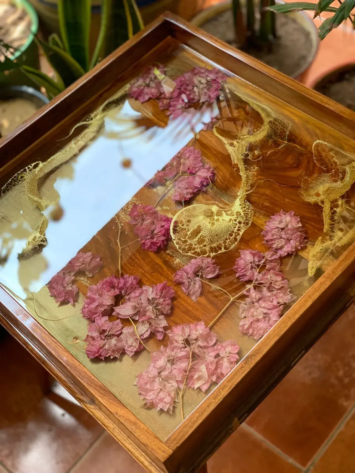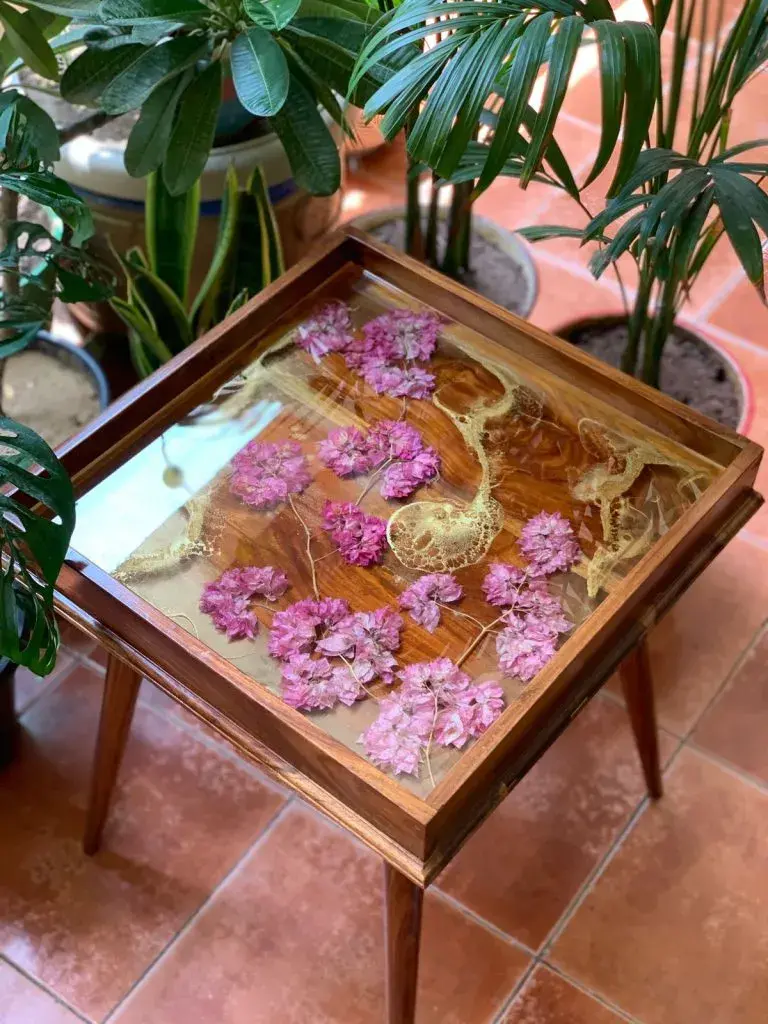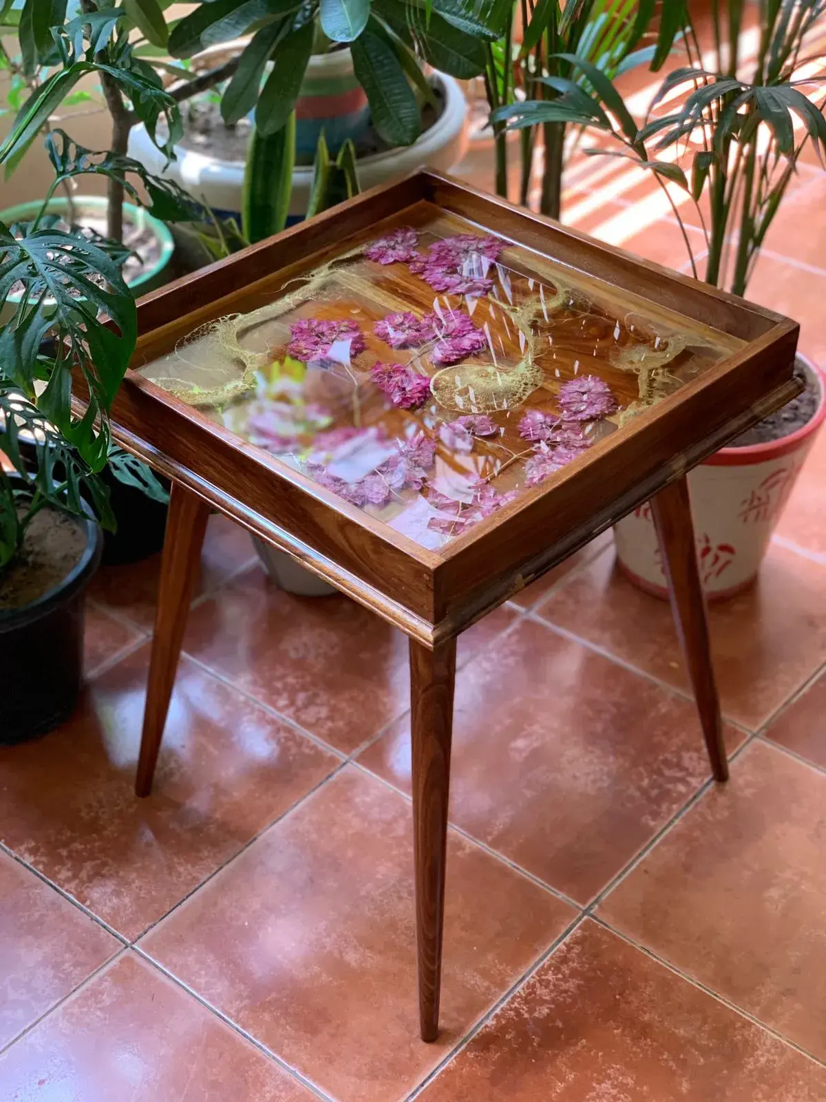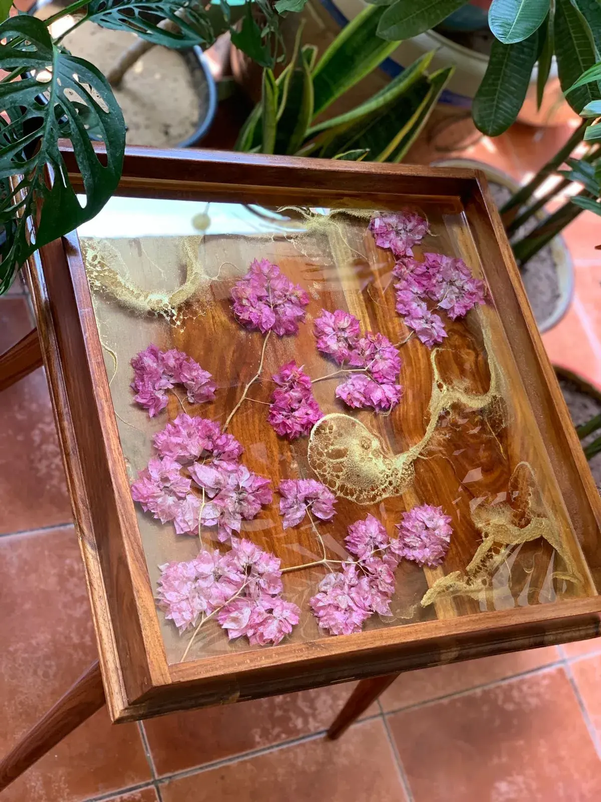 Material: Solid wood, real preserved flowers & epoxy resin Size : 18 x 18 inch, 21 inch heightInstructions:-