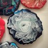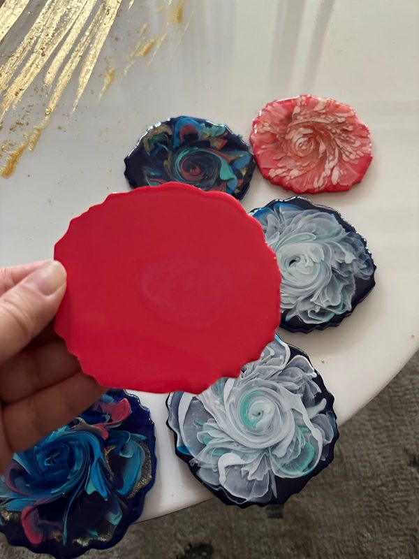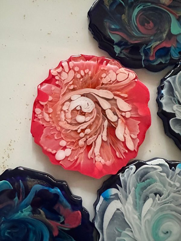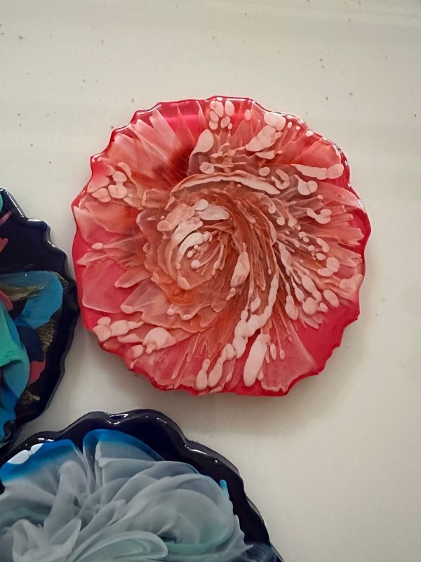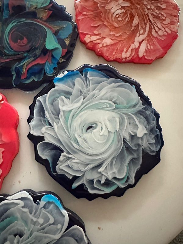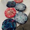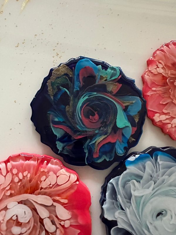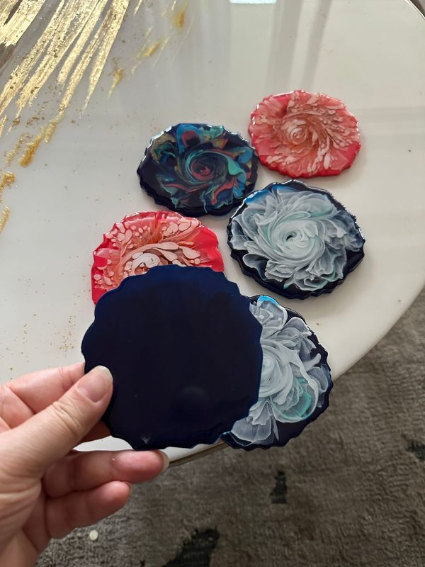 These unique coasters are made of epoxy resin in an assorted pack of 6 with colors in blue, gold and white bright Pink. They are formed in the shape of flowers. They are our specialty design and requires high level of craftsmanship to achieve. They are elegant, glamorous and gives a pop of color to any interiors! They have unique designs on both sides and can be displayed either way. They also make perfect gift items.