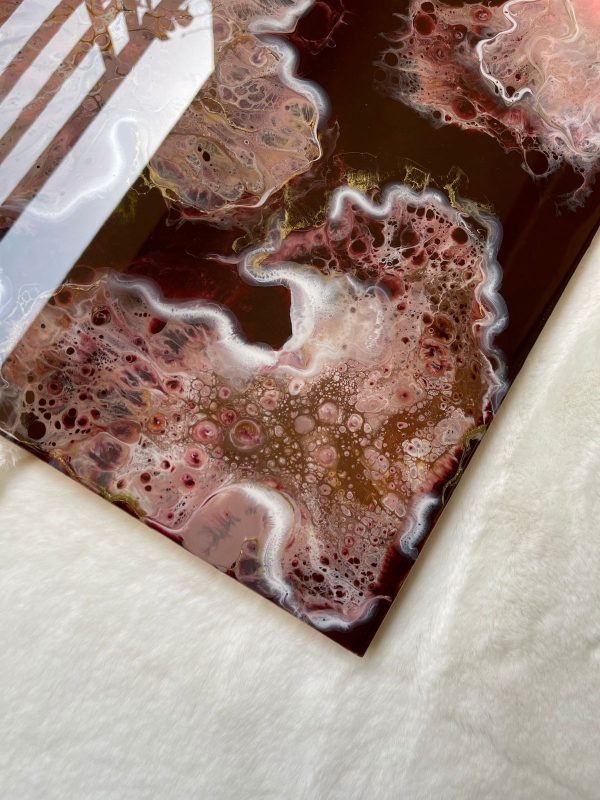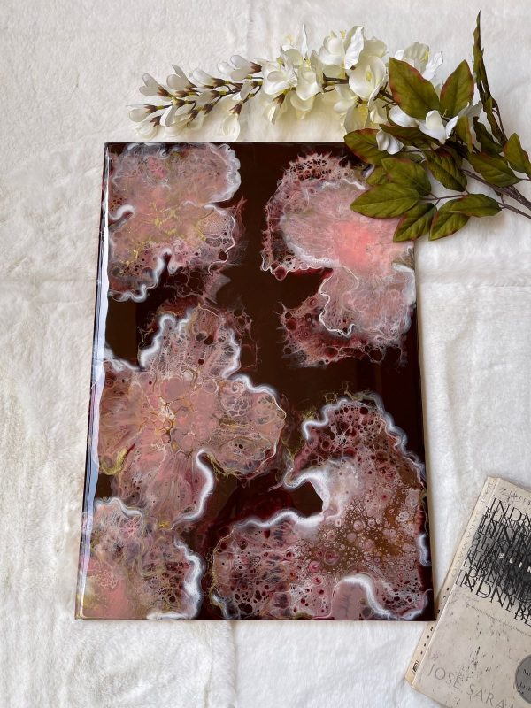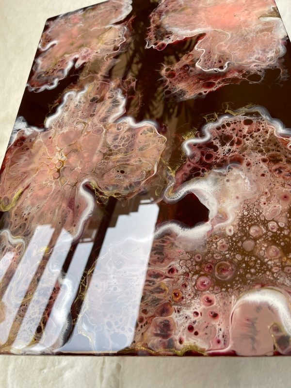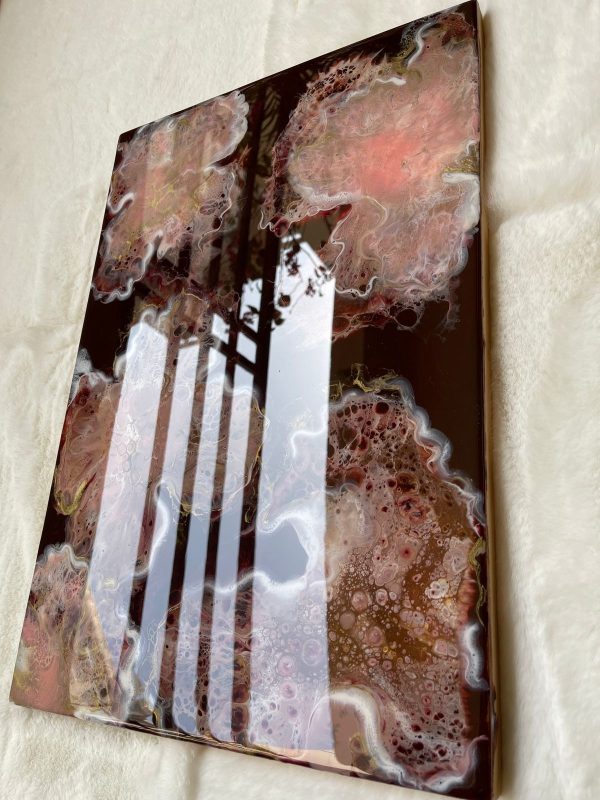 This epoxy resin wall art on a wood panel has a unique abstract design of flowers in shades of pink, gold and white on a rich burgundy background. The details are achieved through a special art technique and is created in layers to achieve the depth and shine.