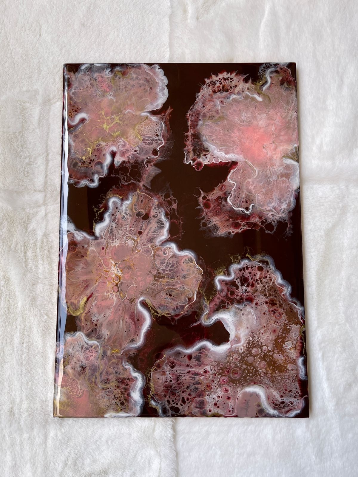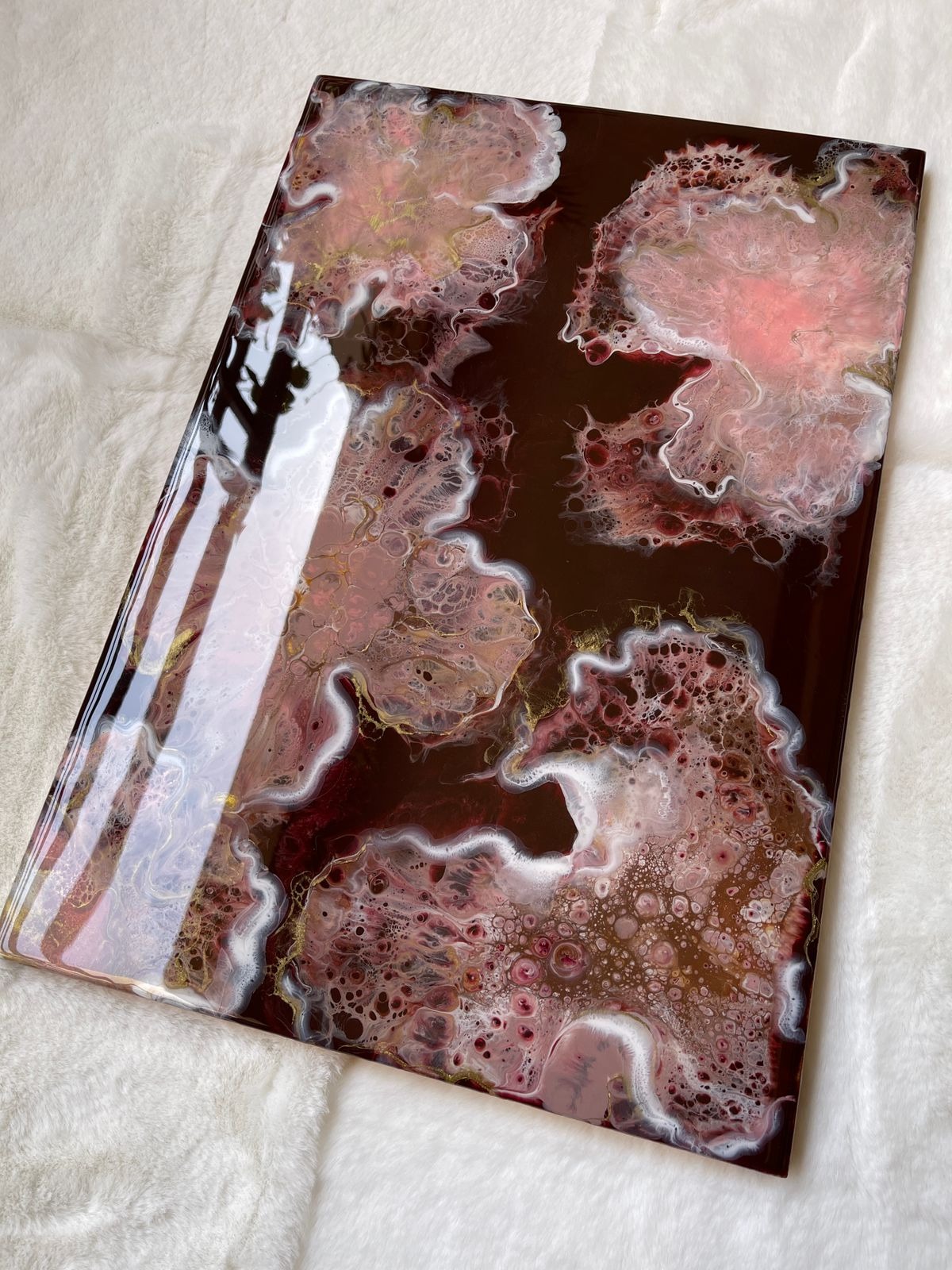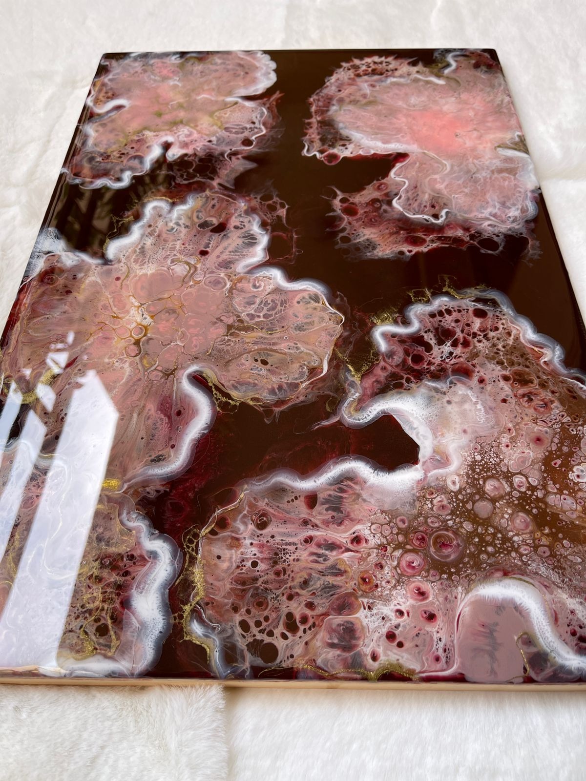This epoxy resin wall art on a wood panel has a unique abstract design of flowers in shades of pink, gold and white on a rich burgundy background. The details are achieved through a special art technique and is created in layers to achieve the depth and shine.