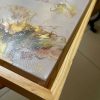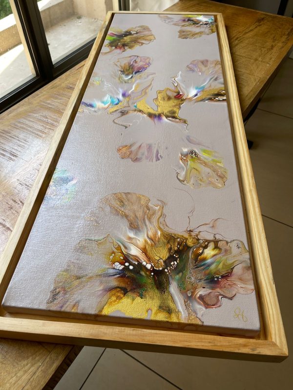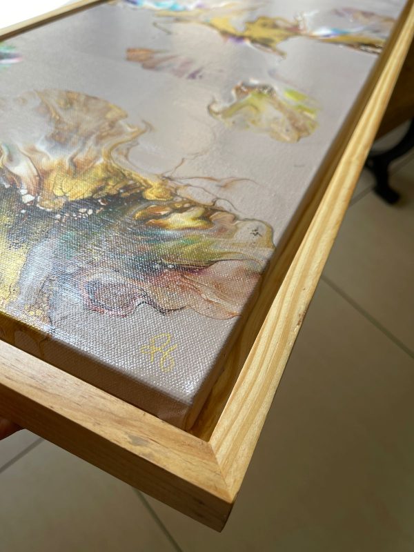 This acrylic painting is an abstract of fluttering gold wings in main colors of brown, white and gold on a simple beige background with dash of several other colors. It’s beautifully framed in a light wood frame and this can be hung both ways, portrait or landscape. It’s a modern statement piece that will brighten your interiors and at the same time blend in due to the use of many colors.