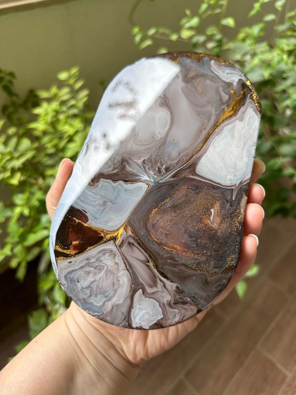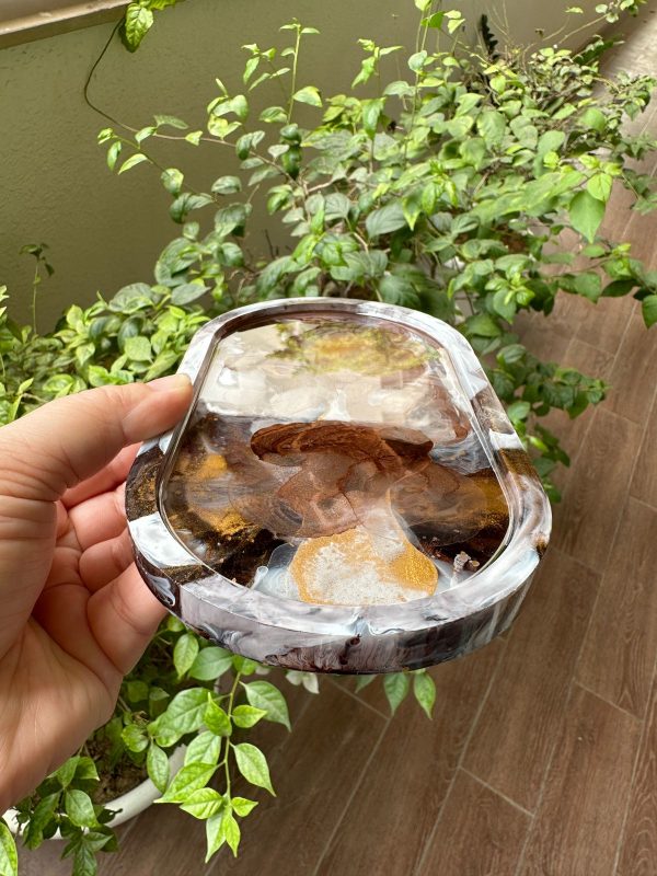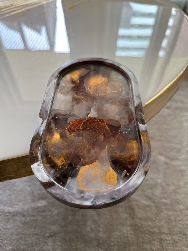 This epoxy resin tray has a unique abstract design in various shades of brown, white and gold! The details are achieved through a special art technique. This can be used as a serving/decorative platter as the resin used is food safe or to store items. It’s a versatile piece.