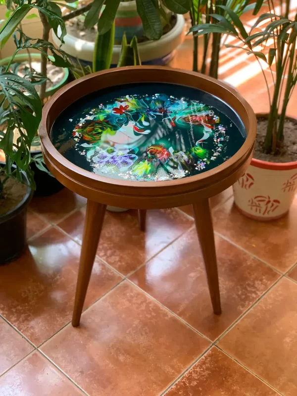 This unique solid wood table has been created in several steps. The design was created as a painting in a mold using epoxy resin and then inserted into the table and adding more layers of resin. We constantly take inspiration from nature and this table resonates that in colors found in nature. The epoxy resin coating lends an unbelievable gloss and is easy to maintain making it durable and very functional. We call it the perfect conversational piece! The stunning wood frame and tripod legs also in natural wood gives it contrast and is elegant!