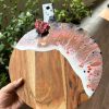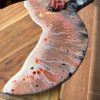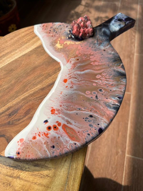This wood serving board has a unique epoxy resin work in shades of purple, coral, pink & frothy white wave with gold highlights! Use it as a cheese board or to serve snacks or just as a centerpiece to add glamour to your food display. This serving platter also makes a unique gift item!