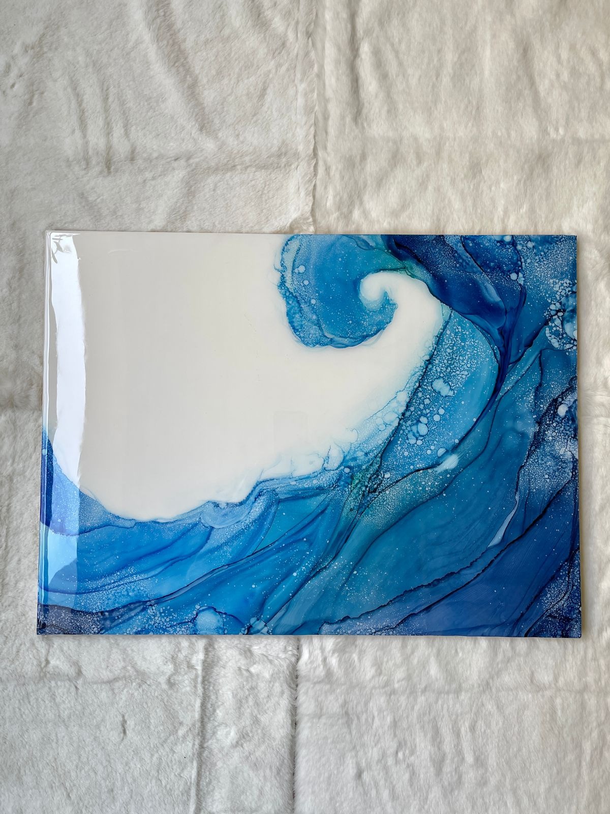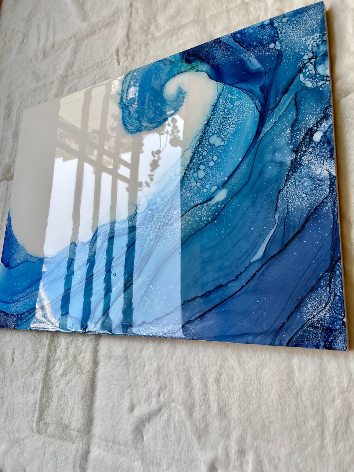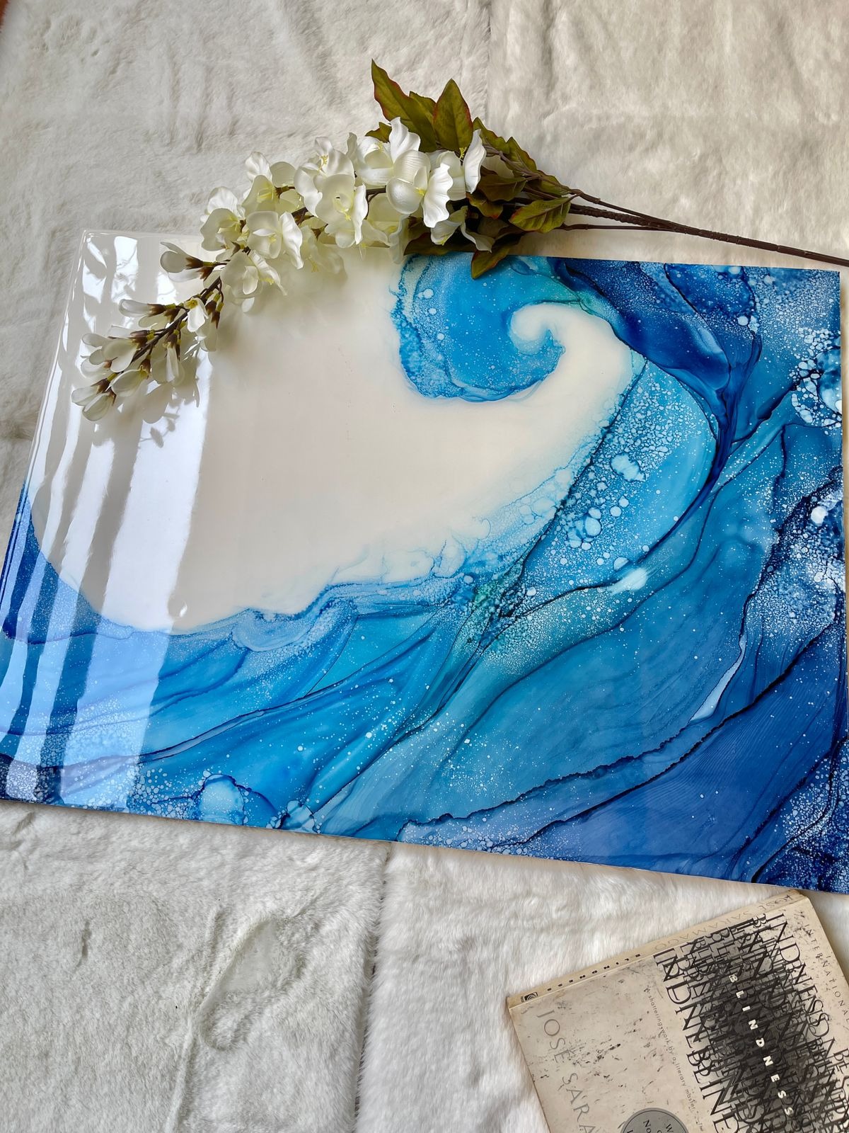 This beautiful wall art has a unique abstract design of a rising ocean wave in shades of blue with a simple white background. This art is created with alcohol inks on Nara paper and finished with Epoxy resin for extra shine. This is mounted on a beautiful wood panel. The details are achieved through a special art technique and is done in our signature style made with a lot of love and care and what we call a perfect conversational piece!