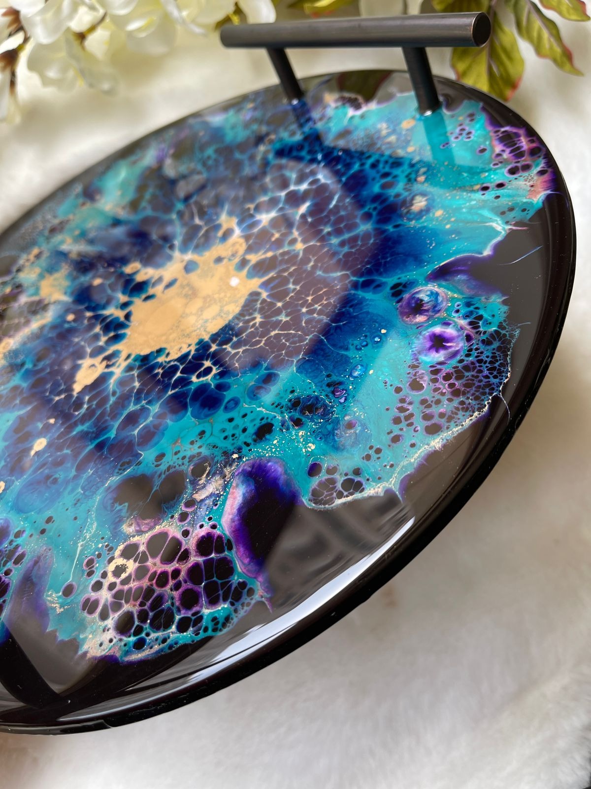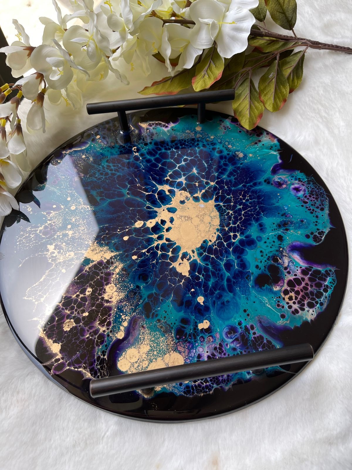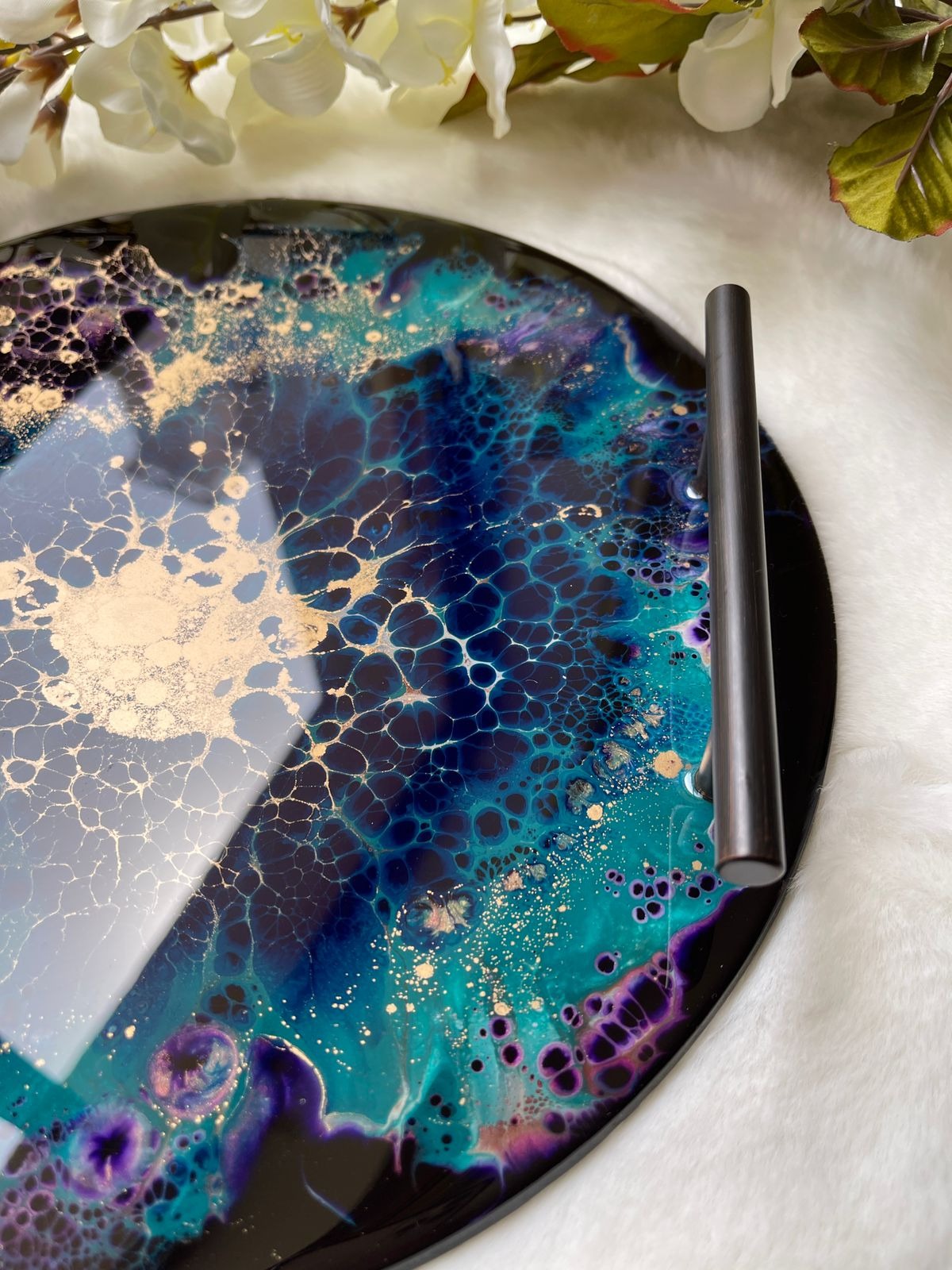 This epoxy resin platter or tray has a unique abstract design of a rare flower in various shades of blue, violet, turquoise, white and gold on a very dark base. The details are achieved through a special art technique and the finish has a high gloss. This can be used as a centerpiece to add glamour to your food display or as a decorative platter and the resin used is food safe. It’s a versatile piece with beautiful black handles and don’t forget to check the back side which has a unique design as well.