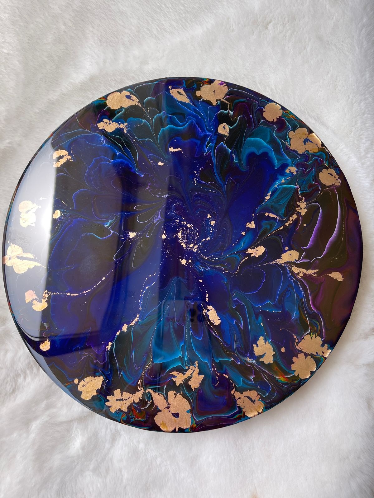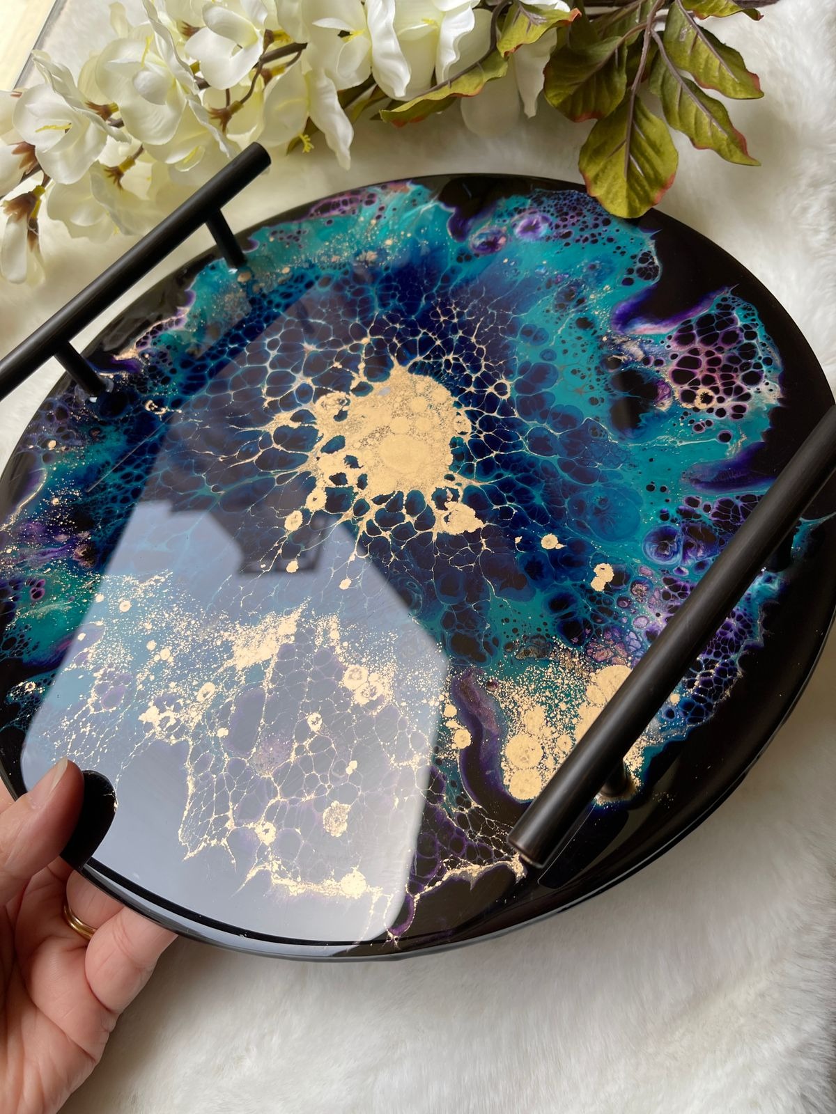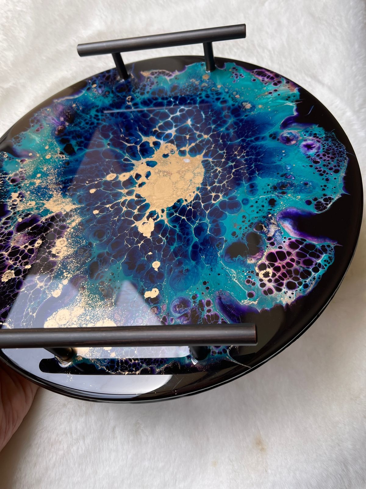 This epoxy resin platter or tray has a unique abstract design of a rare flower in various shades of blue, violet, turquoise, white and gold on a very dark base. The details are achieved through a special art technique and the finish has a high gloss. This can be used as a centerpiece to add glamour to your food display or as a decorative platter and the resin used is food safe. It’s a versatile piece with beautiful black handles and don’t forget to check the back side which has a unique design as well.