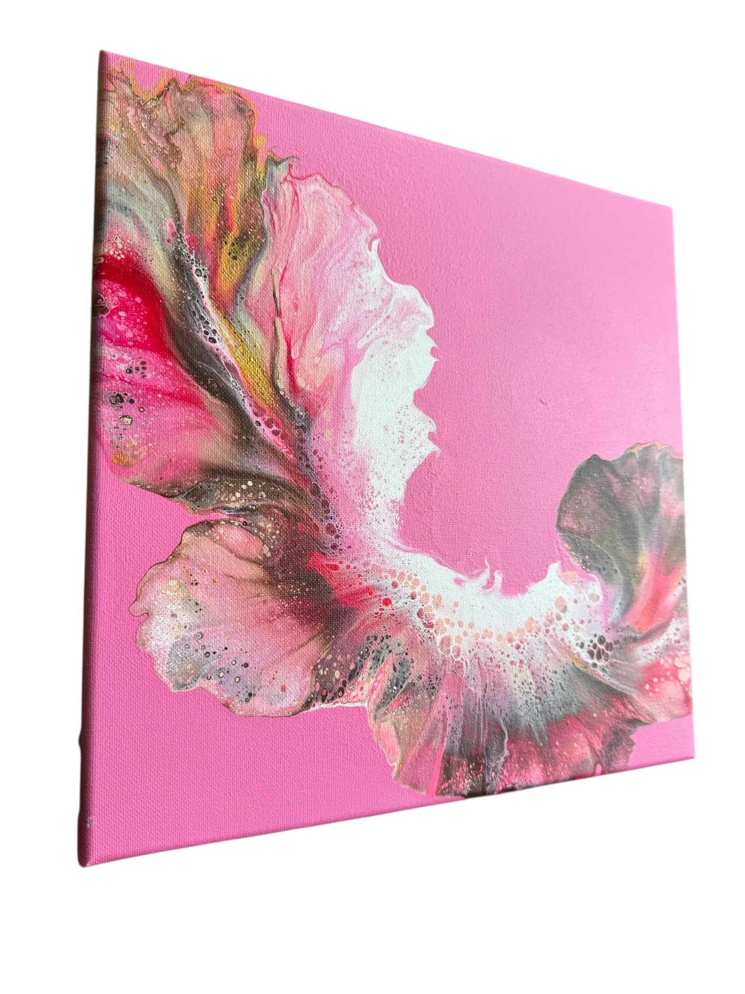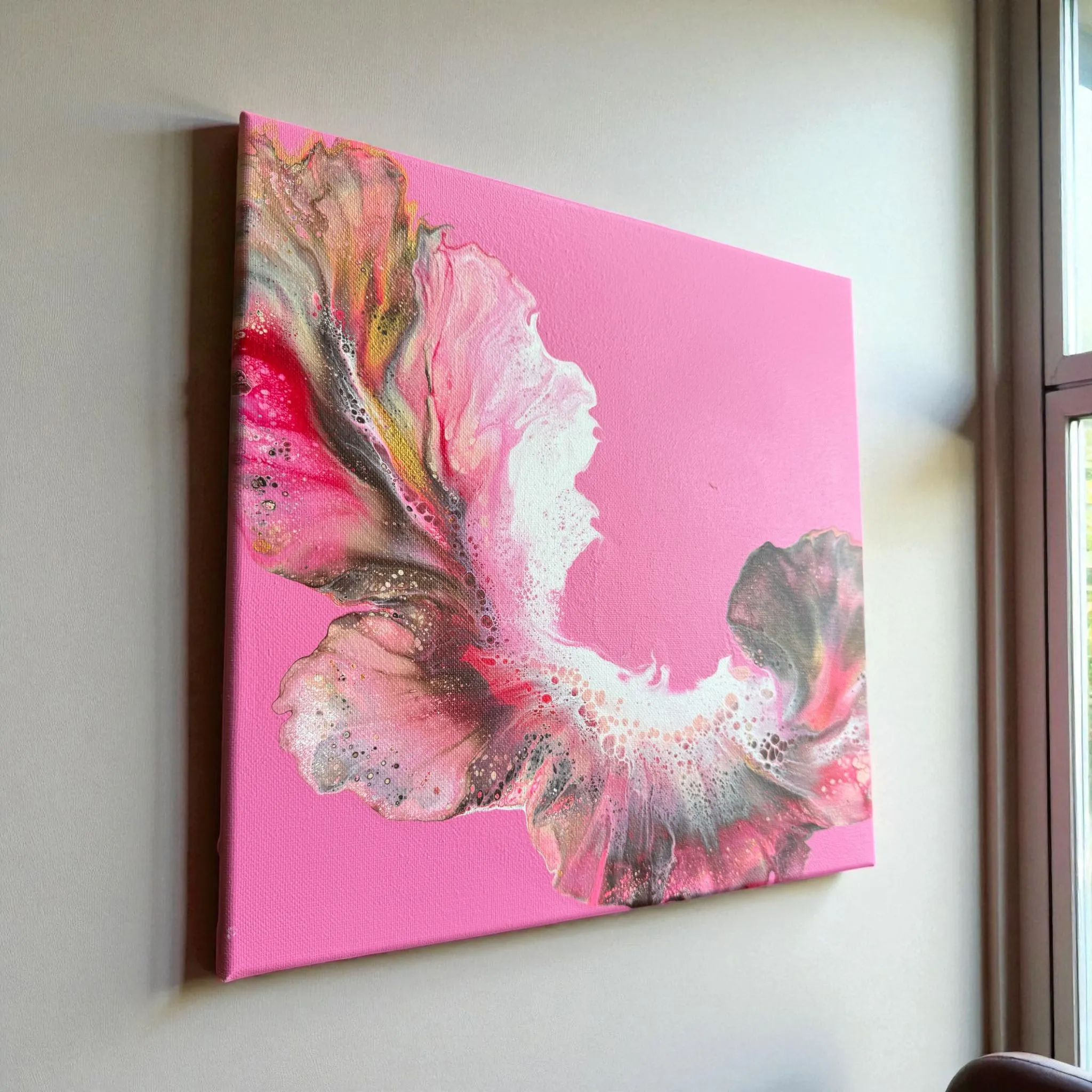 This minimal yet bold abstract Acrylic painting symbolizes a feather freely floating in the air. It has been given a few coats of varnish finish to bring out the colors of Pink, magenta, brown, gold and white.