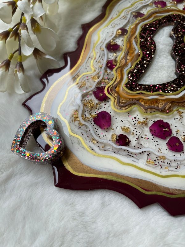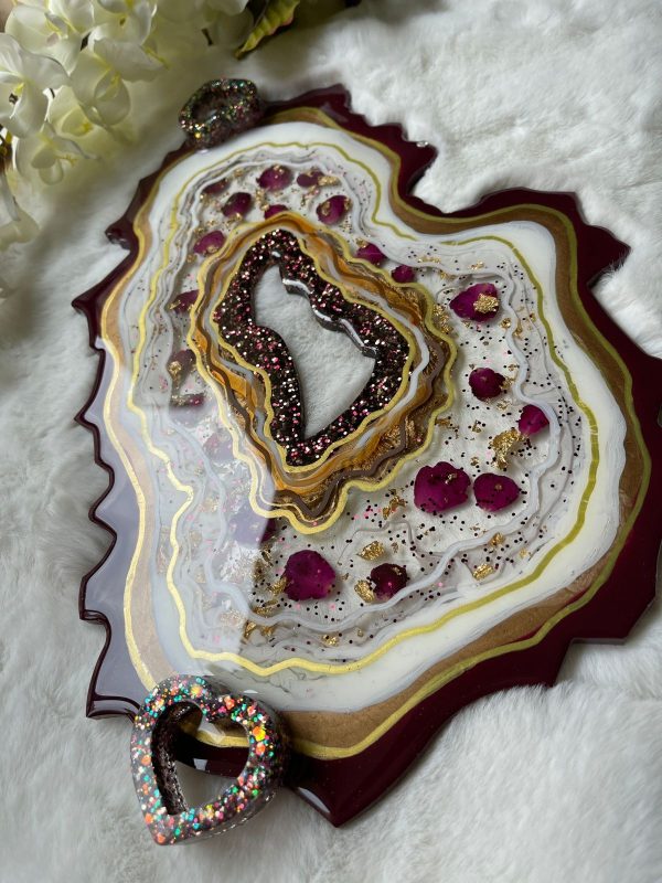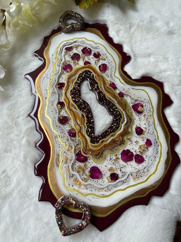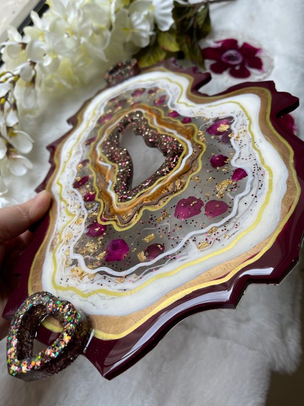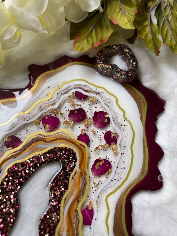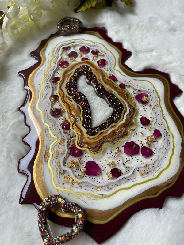 This epoxy resin decorative tray has been created with preserved rose petals combined with burgundy, white and gold details in a geode style. It has been further enhanced with glitter. The details are achieved through a special art technique and the finish has a high gloss. This can be used as a centerpiece to add glamour to your food display as the resin used is food safe or even displayed as a wall art. It’s a versatile piece.