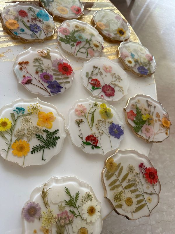 Care instructions: The product has been hand created with a lot of love and care. Please treat it with the same. Since the product is made of epoxy resin, they can be wiped down with a soft damp cloth or even washed gently with soap and water. Flowers used will be random, pics as reference example is shown. For indoor use only.