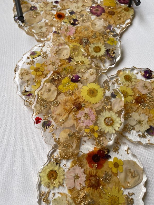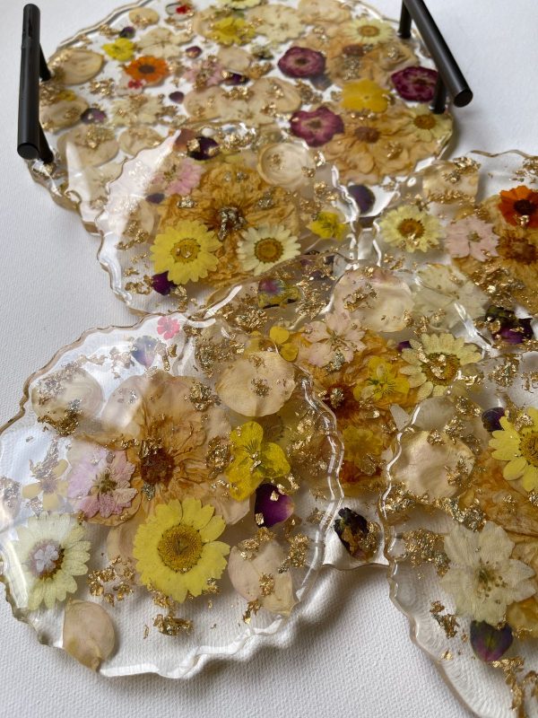 These unique coasters are made of epoxy resin with preserved daisy and rose flowers in yellow, pink and white. They have gold details flakes added for for glamour. These coasters have been created in several layers. They are our specialty preserved flower coasters which are elegant, glamorous and gives a pop of color to any interiors! They also make perfect gift items.
