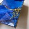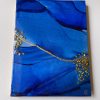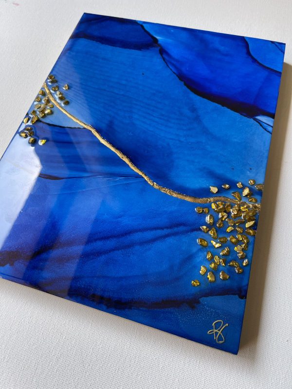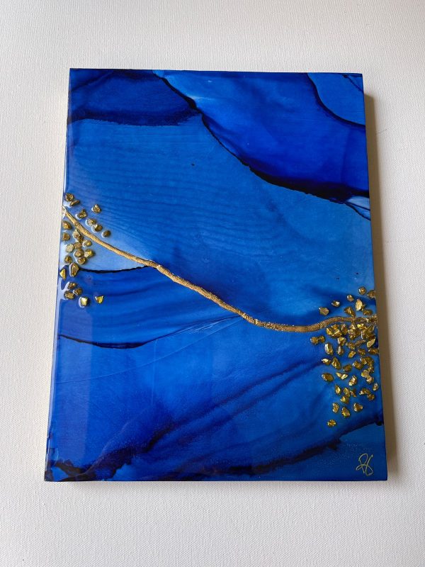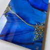 This wall art is created with alcohol inks on Yupo paper and finished with Epoxy resin for extra shine. This is mounted on a beautiful wood panel. The details are achieved through a special art technique and is done in shades of blue with a sprinkling of gold crystals.