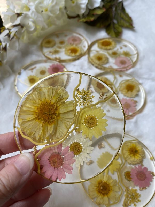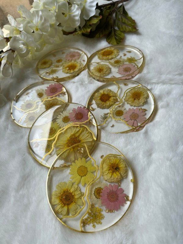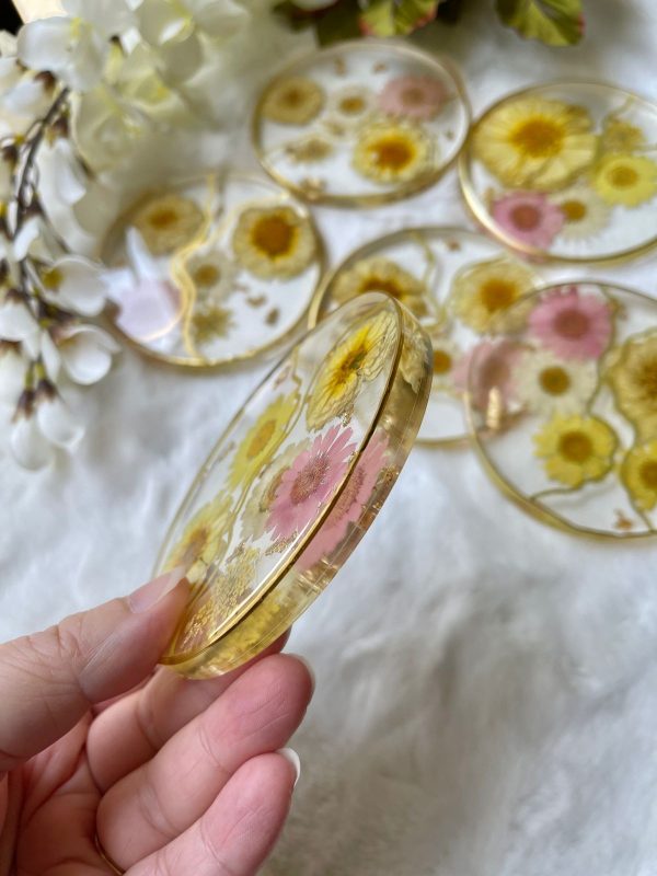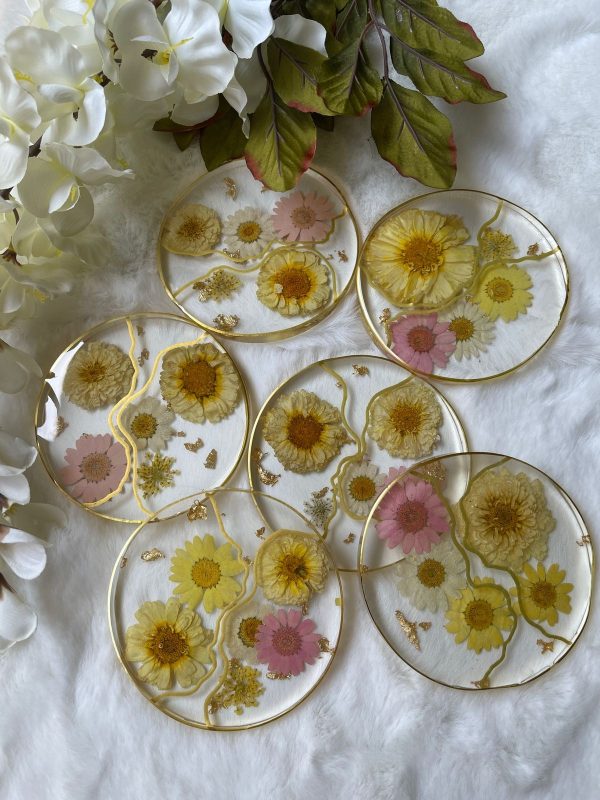These unique coasters are made of epoxy resin with preserved daisy flowers in yellow, pink and white. They have gold details in the center and edges. These coasters have been created in several layers. They are our specialty preserved flower coasters which are elegant, glamorous and gives a pop of color to any interiors! They also make perfect gift items.