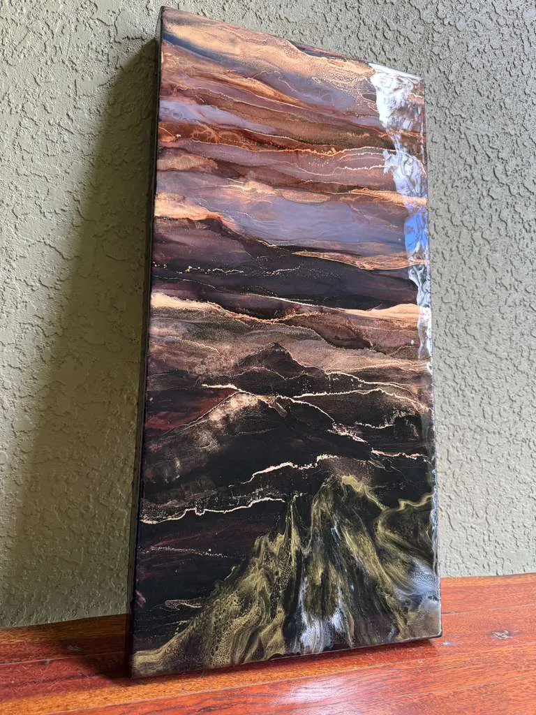This minimal yet bold abstract painting glorifies the sun-kissed peaks of a mountain range. This painting has been created with layers of resin and Alcohol inks and It has been given a final finish of epoxy resin to bring out the colors of rich brown, gold, beige and white and black.
