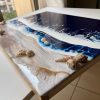 This beautiful wall art has a unique abstract design of the ocean waves on a sandy beach. The colors have been kept deep and dramatic for a more stunning effect. This art is fully created on a wood panel with epoxy resin and real pebbles and shells have been added in a minimalistic approach. The details are achieved through a special art technique and is done in our signature style made with a lot of love and care and what we call a perfect conversational piece!