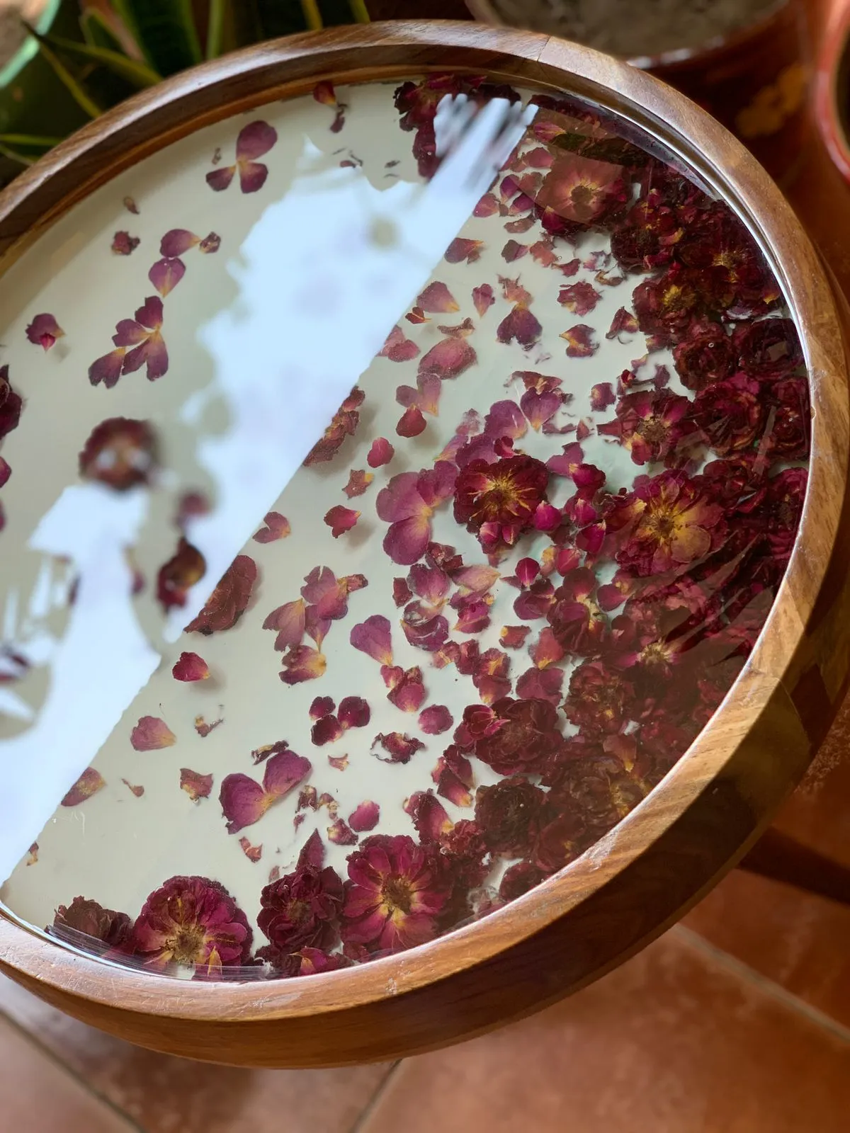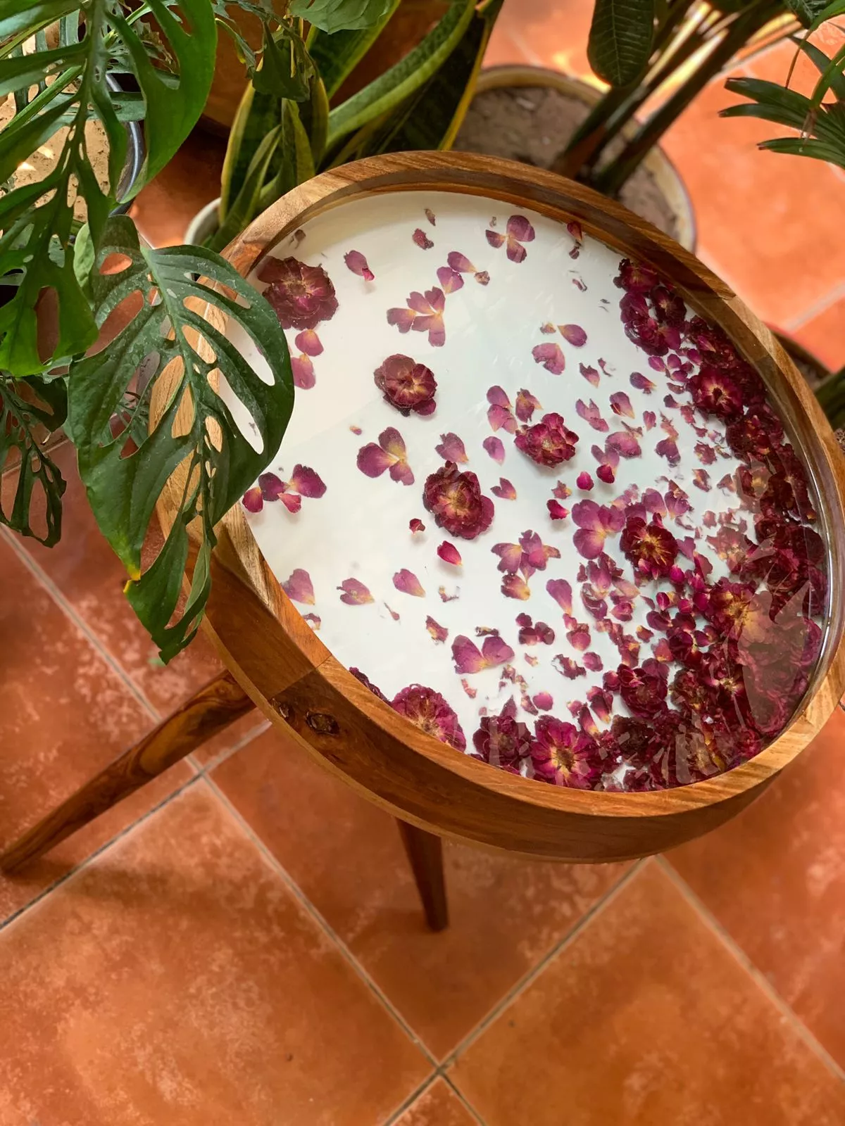 This unique solid wood table has been created with preserved fresh Indian roses embedded in layers of epoxy resin. We constantly take inspiration from nature and this table has flowers which will showcase its beauty for years to come. The epoxy resin coating lends an unbelievable gloss and is easy to maintain making it durable and very functional. We call it the perfect conversational piece! The stunning wood frame and tripod legs also in natural wood gives it contrast and is elegant!