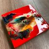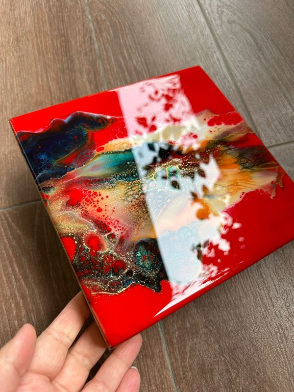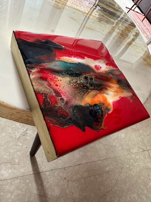 This epoxy resin wall art on wood has a unique abstract design in reds, black, orange, white, teal and gold. It’s a vibrant piece and an attention seeker despite its small size. The details are achieved through a special art technique and is created in layers to achieve the depth and shine.