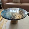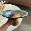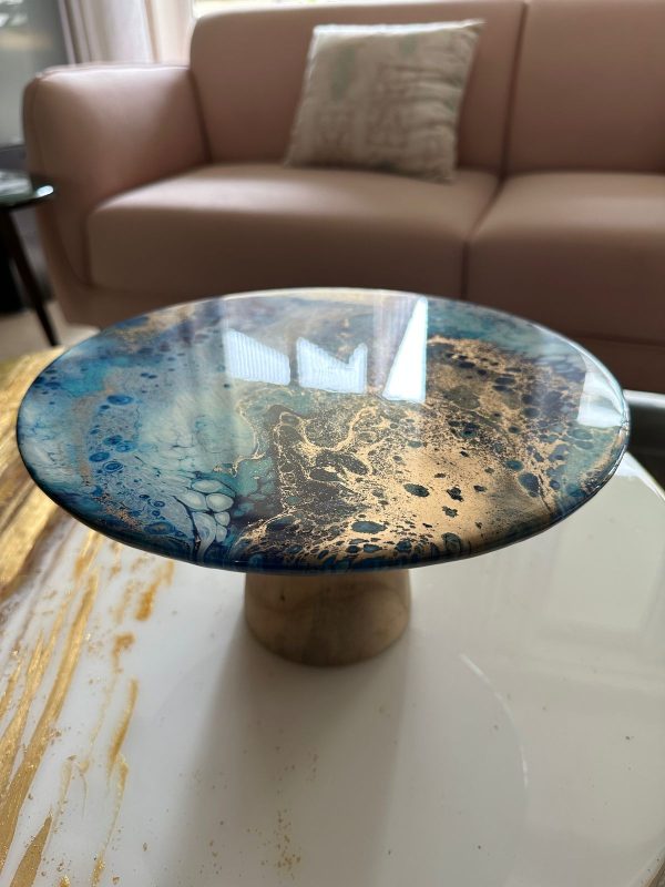 This epoxy resin cake stand on a beautiful solid wood base has a unique abstract design in various shades of blue, white and gold! The details are achieved through a special art technique. This can be used as a centerpiece to add glamour to your food display or as a decorative platter, cake stand as it’s base is on solid wood and the resin used is food safe. It’s a versatile piece.