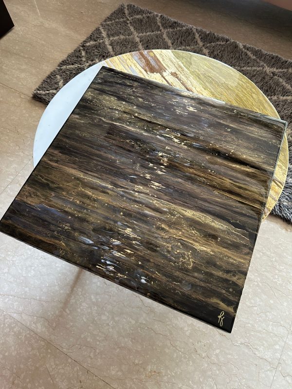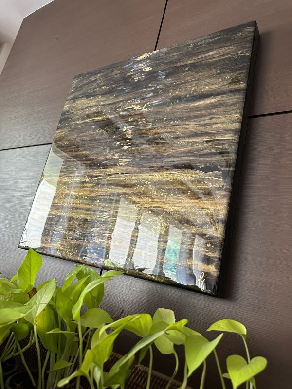 This beautiful wall art has a unique abstract design in black and gold. This art is created with layers of pigmented resin and alcohol ink and finished with 2 final coats of clear Epoxy resin for extra shine. The details are achieved through a special art technique and is done in our signature style made with a lot of love and care and what we call a perfect conversational piece!