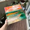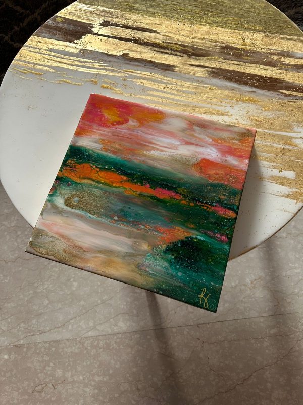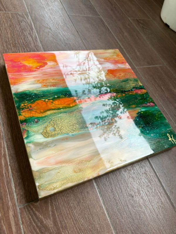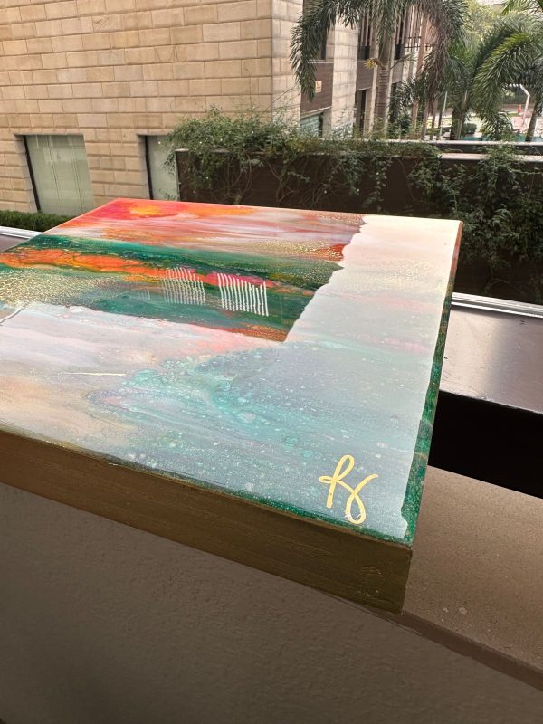This abstract painting done completely in resin is inspired by the scenic landscapes found in nature. The striking colors chosen are shades of orange, green, pink, white and gold. It’s beautifully finished in clear epoxy resin and the deep edge canvas is wood base. The edges have been further enhanced with gold paint and varnish. It’s a modern statement piece that will brighten your interiors and at the same time blend in due to it’s beautiful rich colors.
