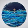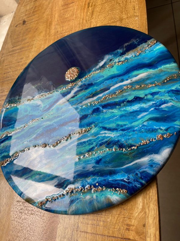 This epoxy resin wall art on a solid teak wood base has a unique abstract design of an ocean with the gold shimmer of the moon in various shades of blues, white and gold! The details are achieved through a special art technique.