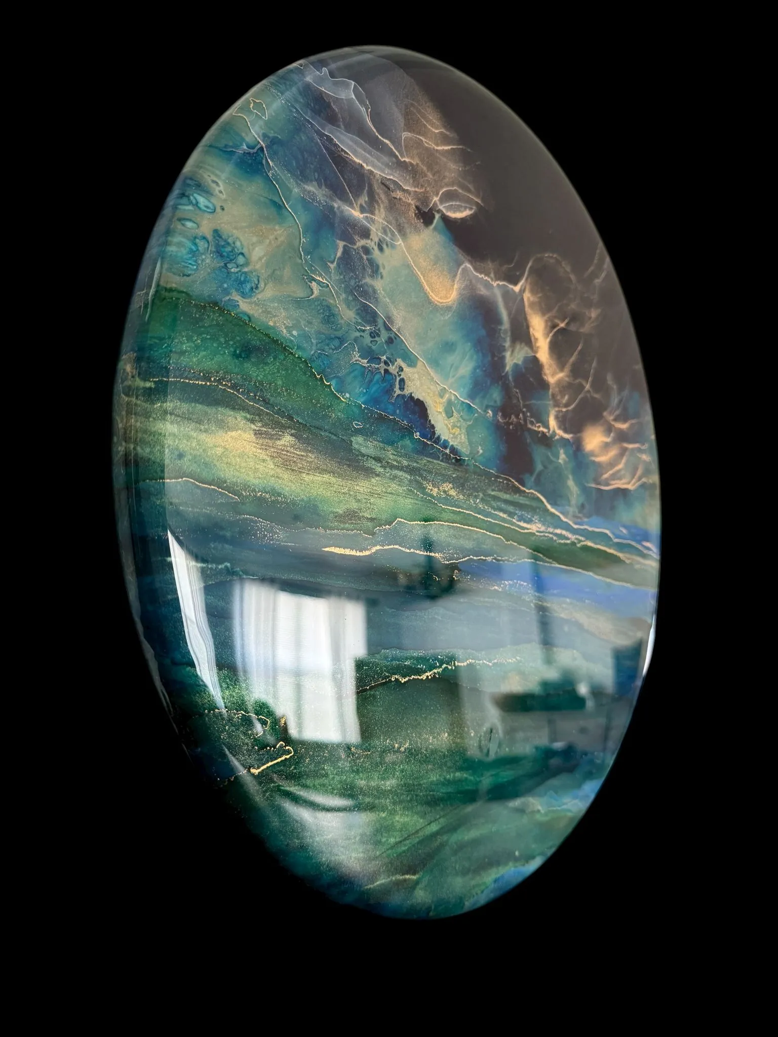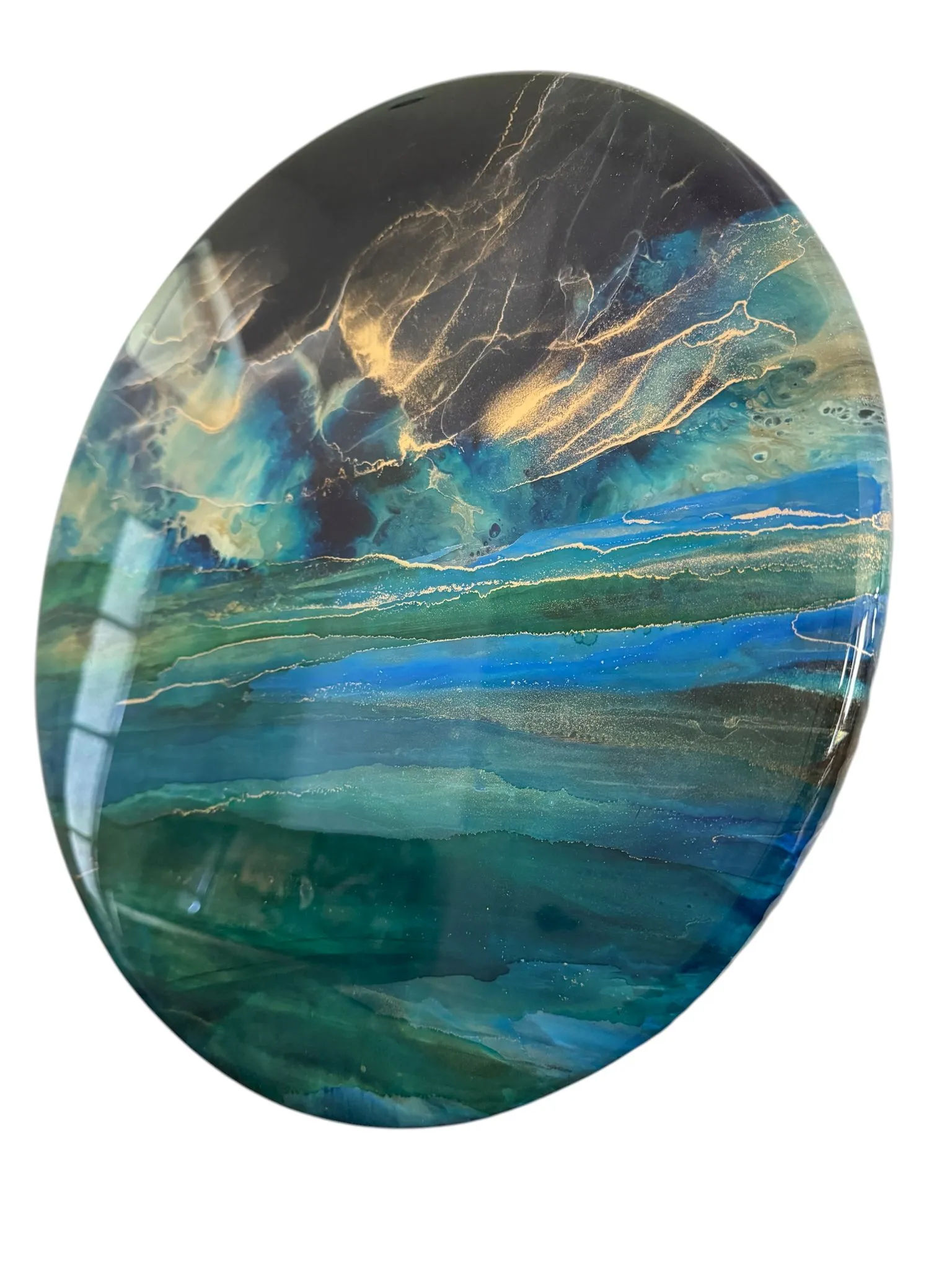 When the sunset creates vivid hues over the blue ocean and sky at the horizon merging the two. The abstract details are achieved through a special art technique using Resin and has been further enhanced with Alcohol Inks to create depth. A final layer of clear resin gives it the perfect finish and shine