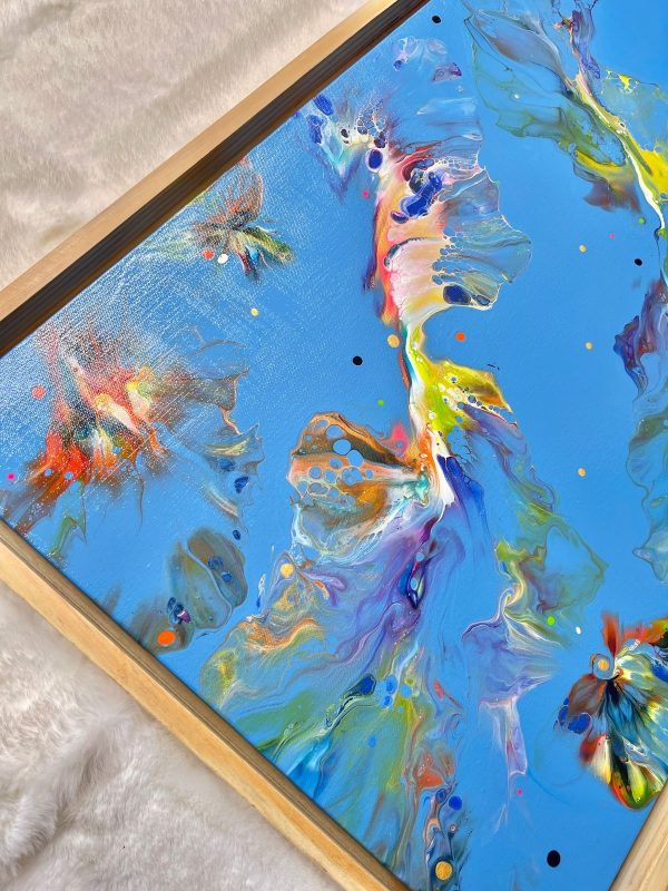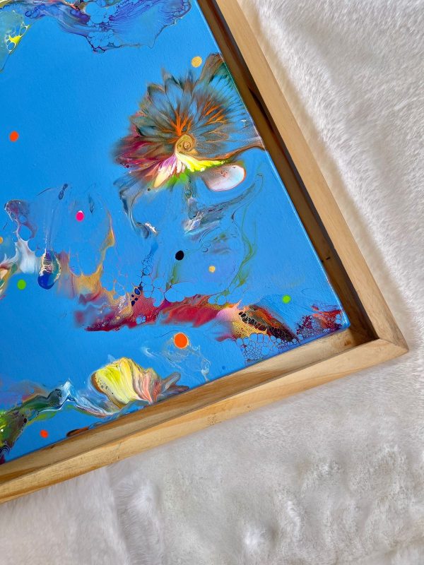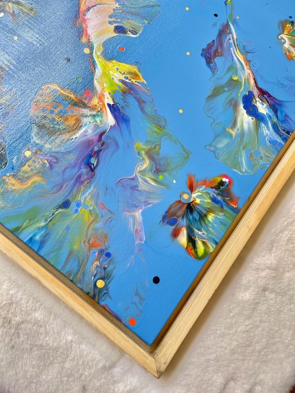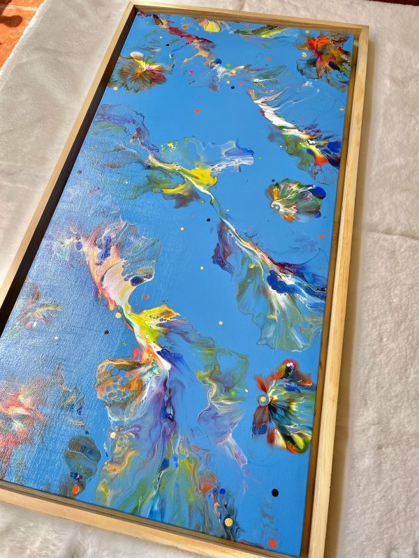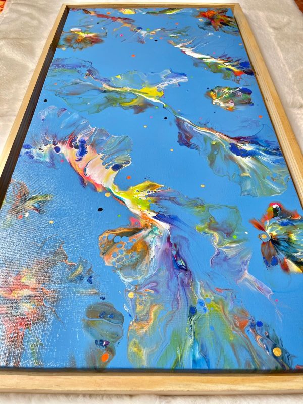 This acrylic painting is an abstract of the vivid underwater ocean life in colors of green, orange, blue, yellow, violet, white and gold on a vibrant blue background. It’s beautifully framed in a light wood frame and this can be hung both ways, portrait or landscape. It’s a modern statement piece that will brighten your interiors and at the same time blend in due to the use of many colors.