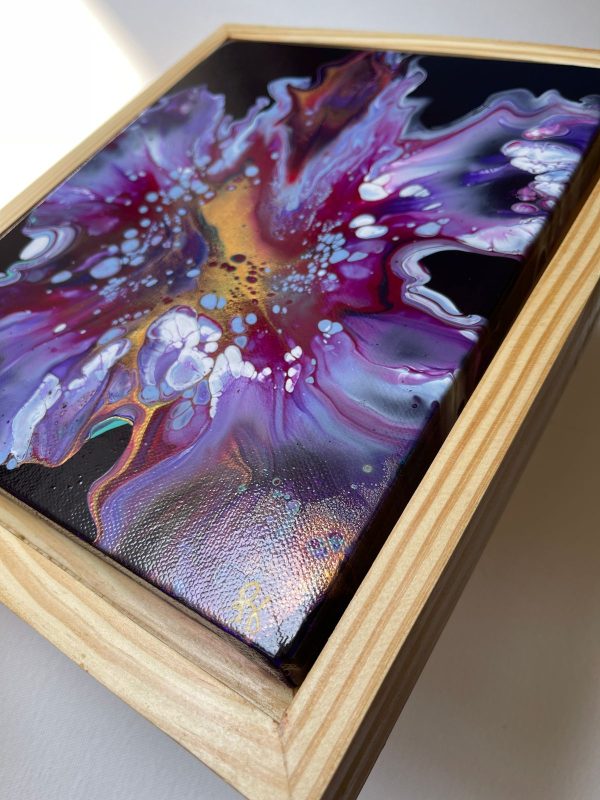 This acrylic painting is an abstract of an exotic orchid in colors of lilac, burgundy, turquoise, white and gold on a vibrant pink/burgundy background. It’s beautifully framed in a light wood frame and this can be hung both ways. It’s a modern statement piece that will brighten your interiors and at the same time blend in due to the use of many colors.