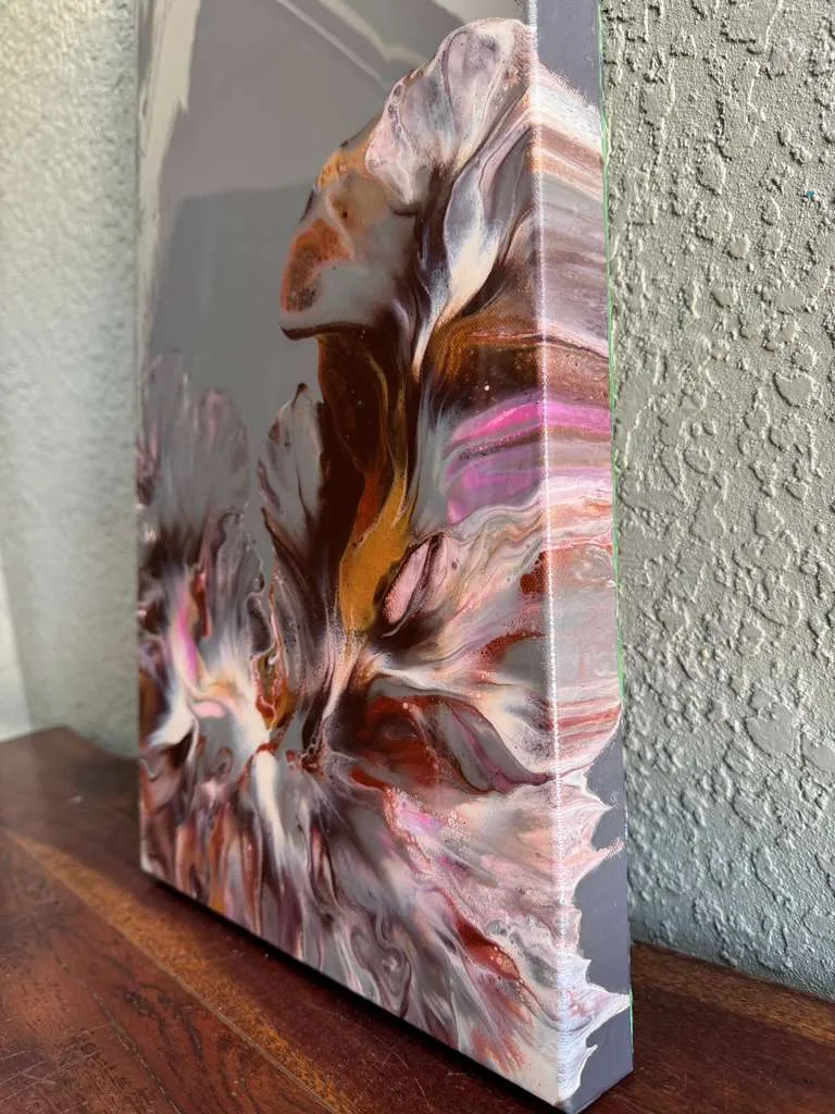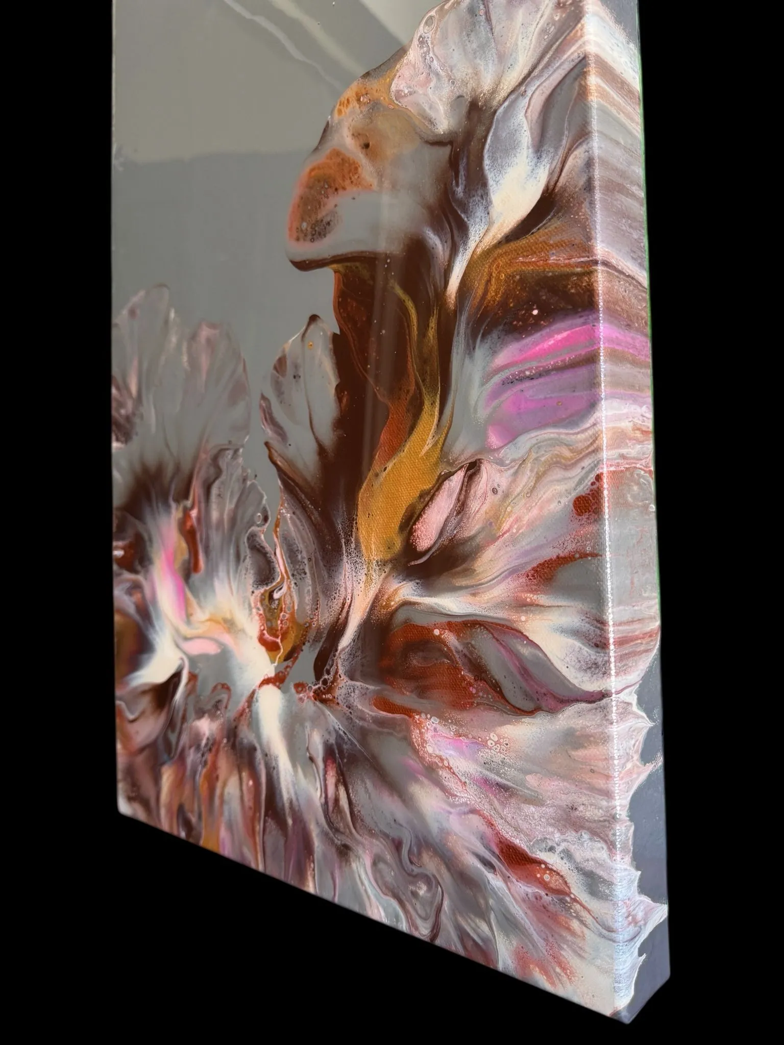 This minimal yet bold abstract Acrylic painting symbolizes the beauty of a Rising Phoenix. It has been given an epoxy resin finish to bring out the colors of rich brown, gold, beige and white, grey and pink.