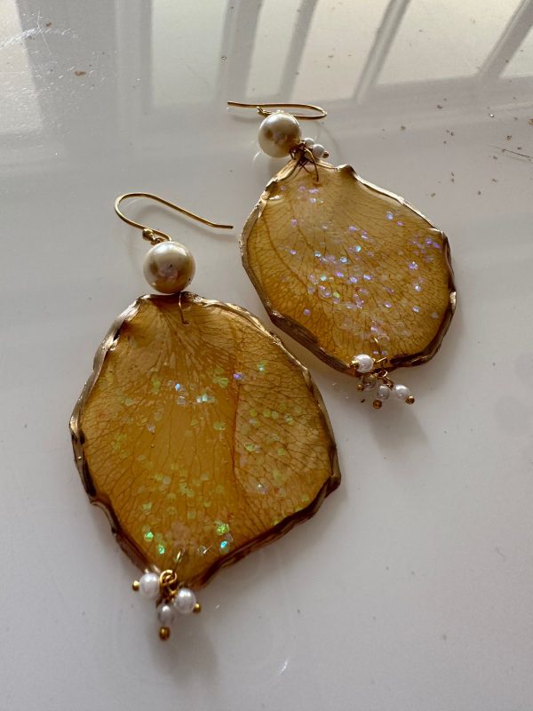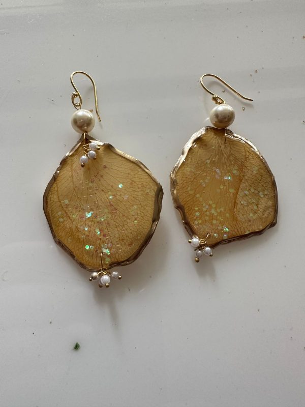 These are made from carefully selected flower petals, preserved through a special technique and then these are given a resin finish while still trying to maintain the natural shape. This is then strung with pearls into a unique, organic shaped and natural looking pieces which are quirky, fun and asymmetrical!