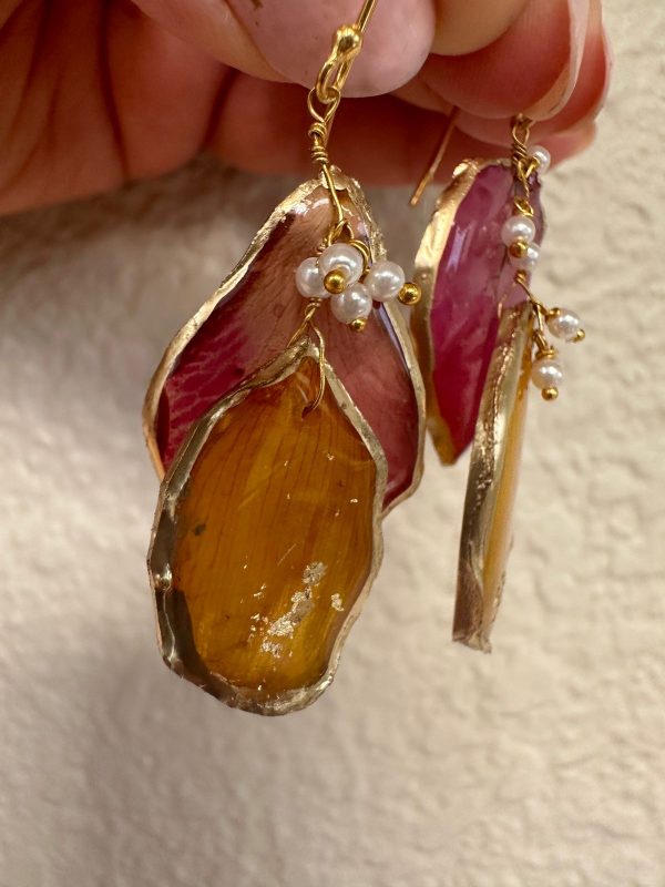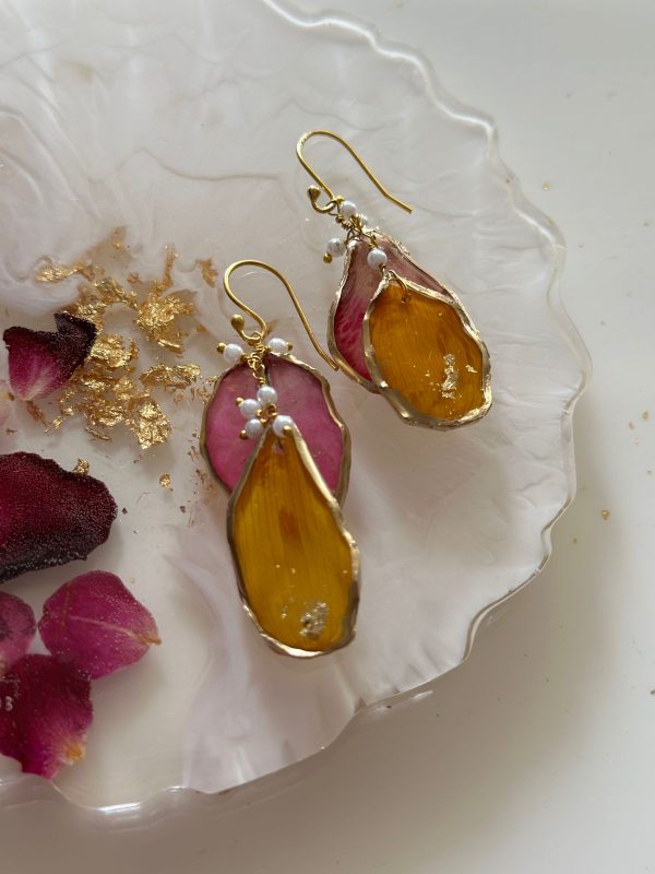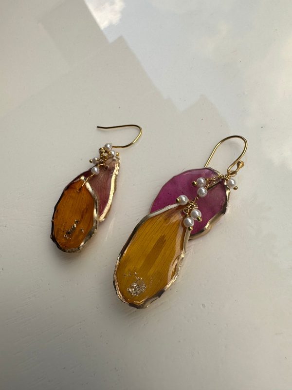 These are made from carefully selected flower petals, preserved through a special technique and then these are given a resin finish while still trying to maintain the natural shape. This is then strung with pearls into a unique, organic shaped and natural looking pieces which are quirky, fun and asymmetrical!