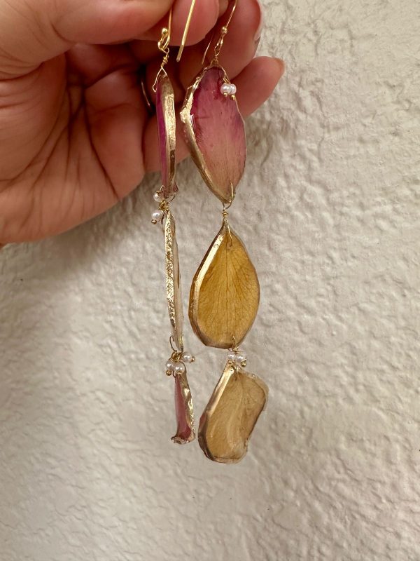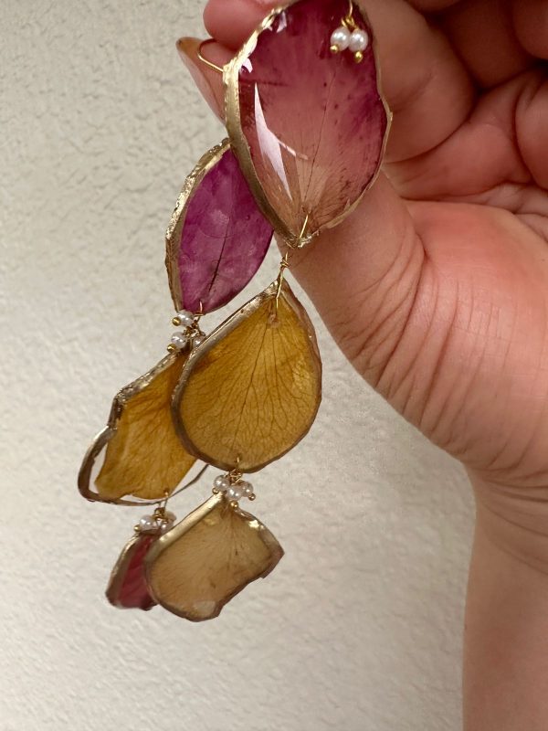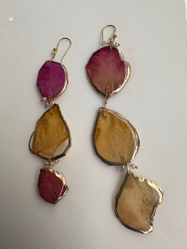 These are made from carefully selected flower petals, preserved through a special technique and then these are given a resin finish while still trying to maintain the natural shape. This is then strung with pearls into a unique, organic shaped and natural looking pieces which are quirky, fun and asymmetrical!
