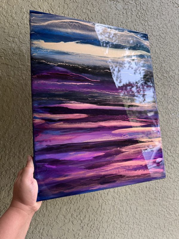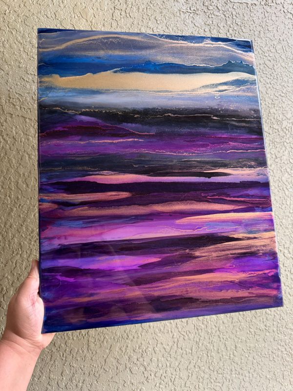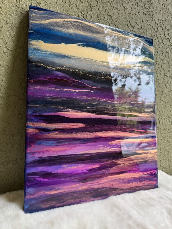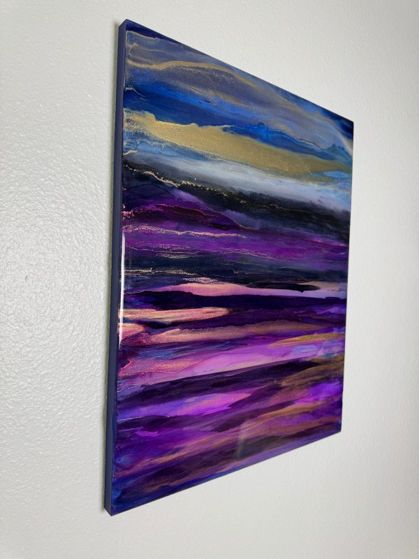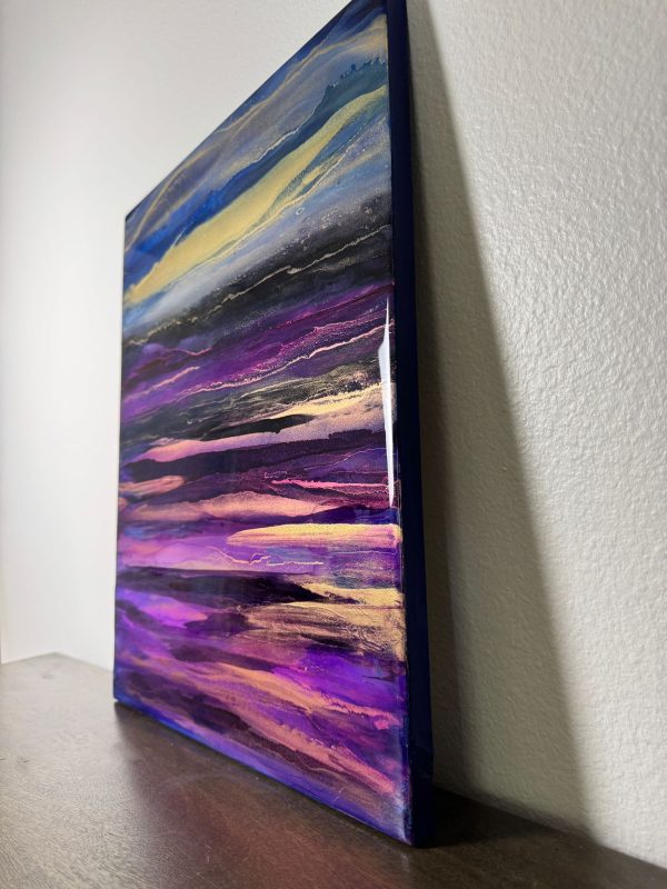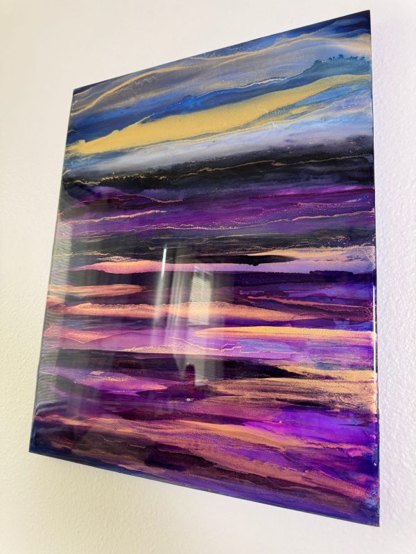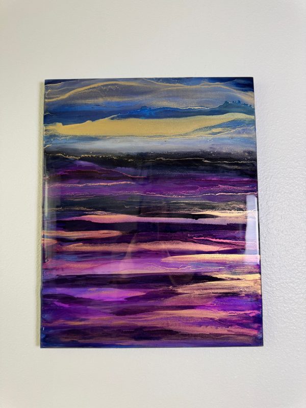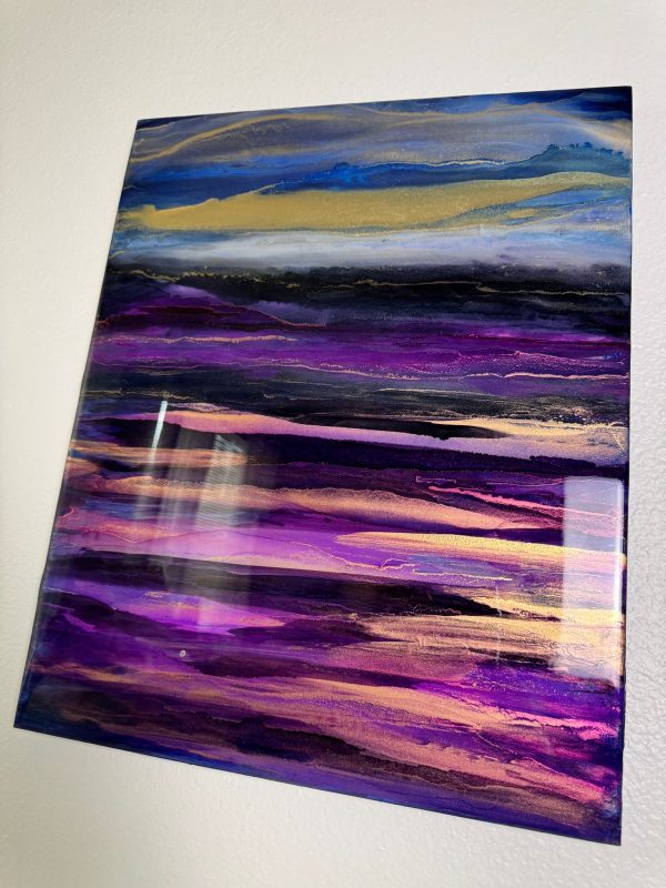 Vivid gold dusk washing over violet landscape. The abstract details are achieved through a special art technique using Resin and has been further enhanced with Alcohol Inks to create depth. A final layer of clear resin gives it the perfect finish and shine