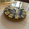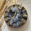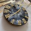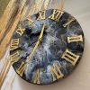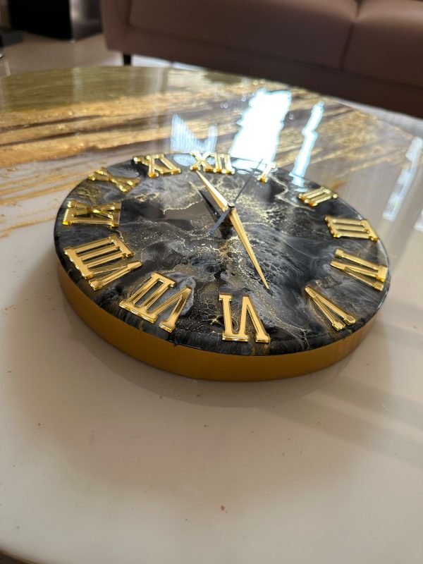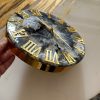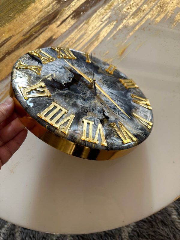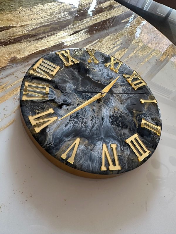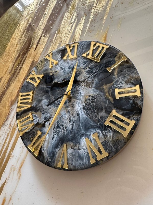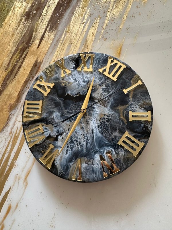 This epoxy resin Wall Clock is done on a metal base and has a unique abstract wave design in shades of black, white with gold highlights and a sharp gold frame. The details are achieved through a special art technique in fluid art.