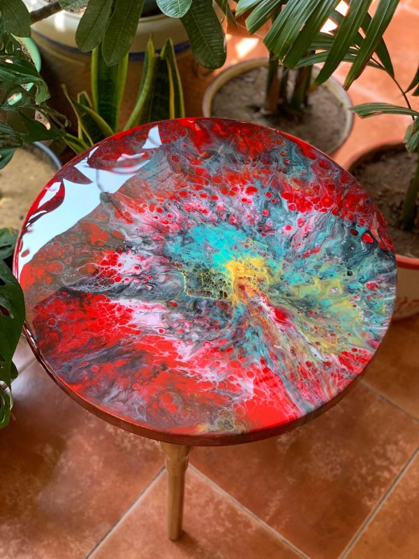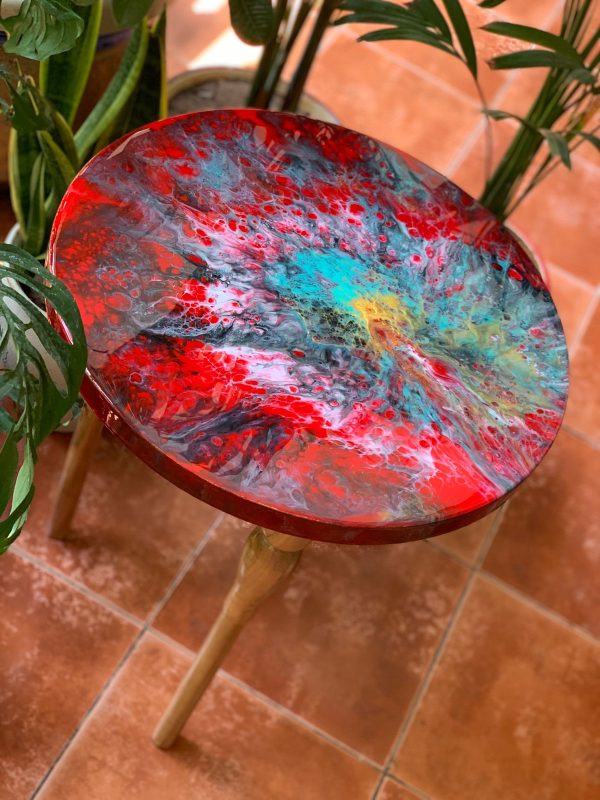 This unique solid wood table has an epoxy resin finish on the table top in an abstract design in shades of red, blues and gold. The epoxy resin coating lends an unbelievable gloss and is easy to maintain making it durable and very functional. We call it the perfect conversational piece! The stunning wood base and tripod legs also in natural wood gives it contrast and is elegant!