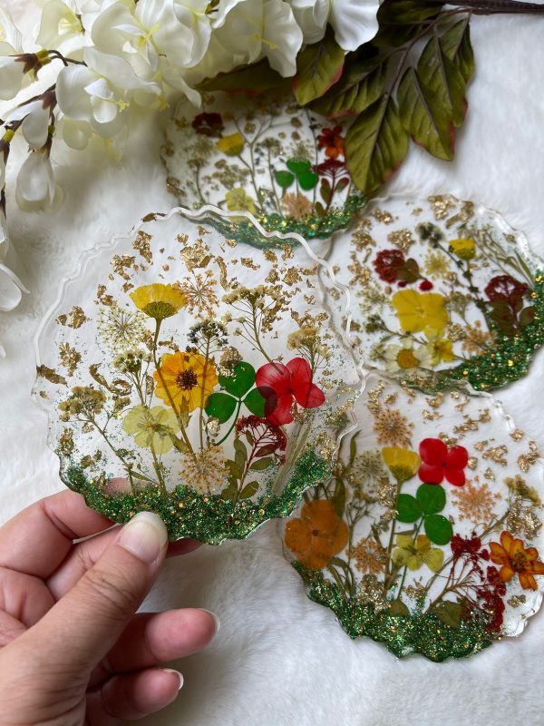 These unique coasters are made of epoxy resin with different preserved flowers in yellow, pink, and green. They have gold flakes and green glitter added for glamour. These coasters have been created in several layers. They are our specialty preserved flower coasters which are elegant, glamorous and gives a pop of color to any interiors! They also make perfect gift items.