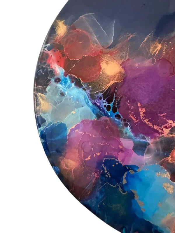 This thought has been further emphasized by combining mediums and techniques of resin and alcohol inks to create pieces that truly symbolize abstract art. The high gloss resin finish is contemporary and in alignment with art that is forward looking.