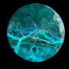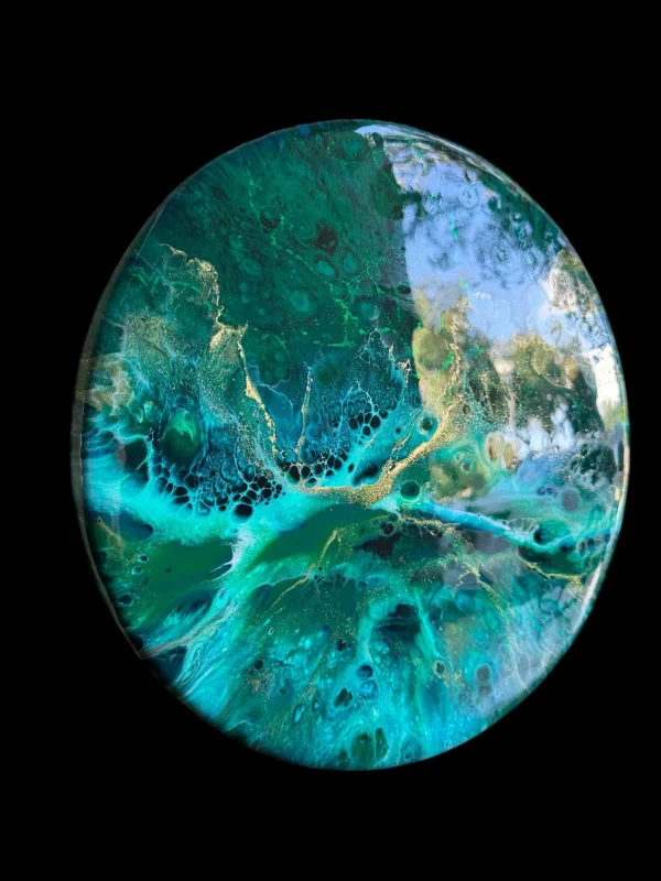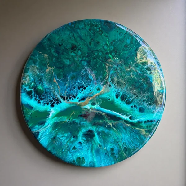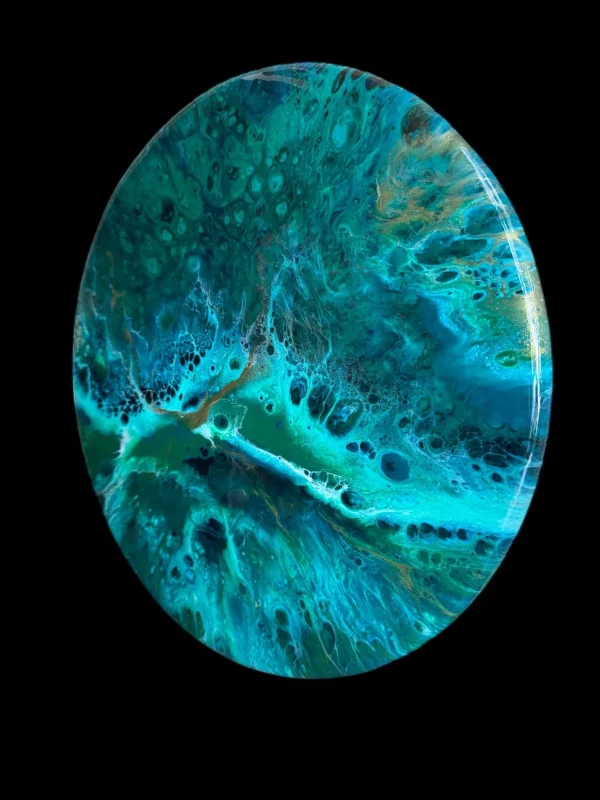 Looking into the depth of a turquoise sea. The abstract details are achieved through a special art technique using resin snd working in layers to create depth and details. A final layer of clear resin gives it the perfect finish and shine