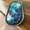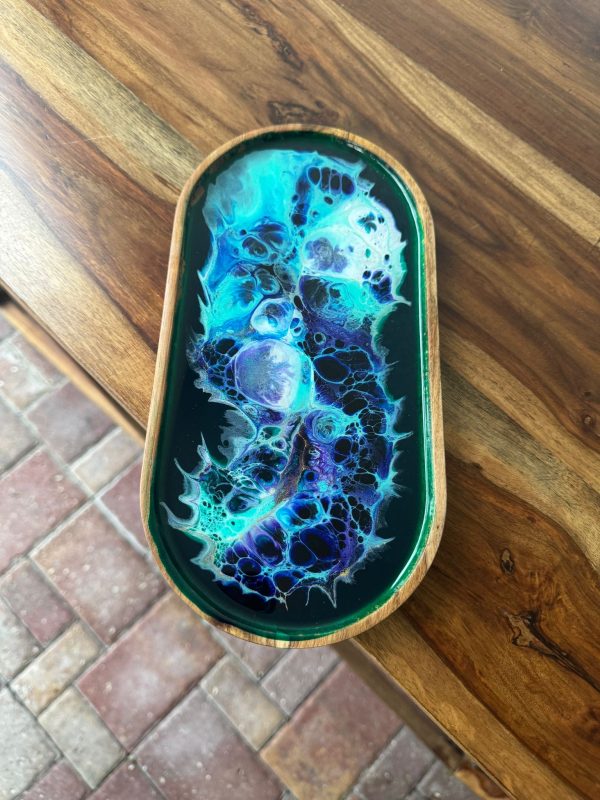 This epoxy resin tray has a unique abstract design in epoxy resin in deep green, turquoise, white and blue! This can be used as a serving/decorative platter as the resin used is food safe or to store items. It’s a versatile piece.