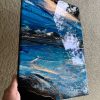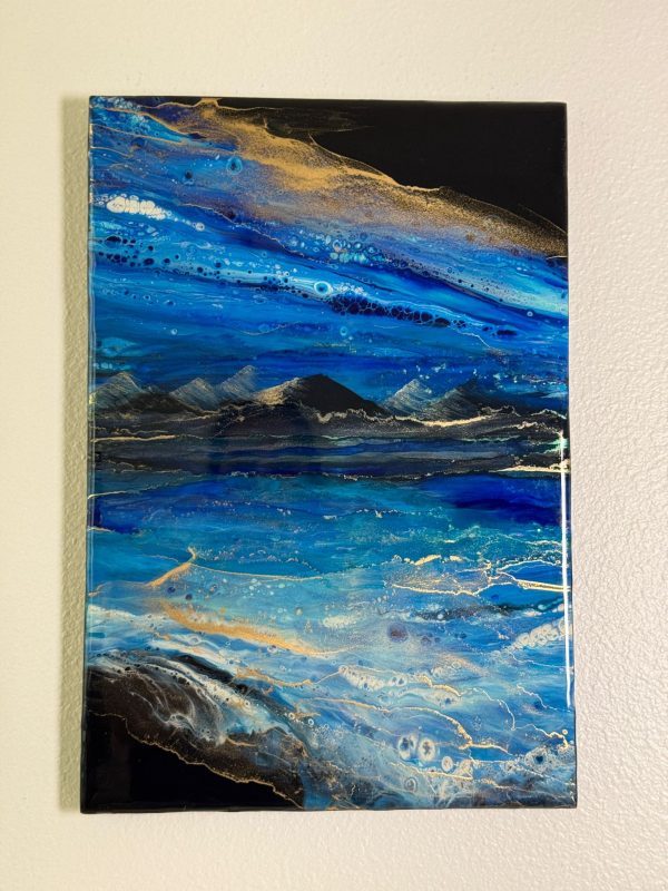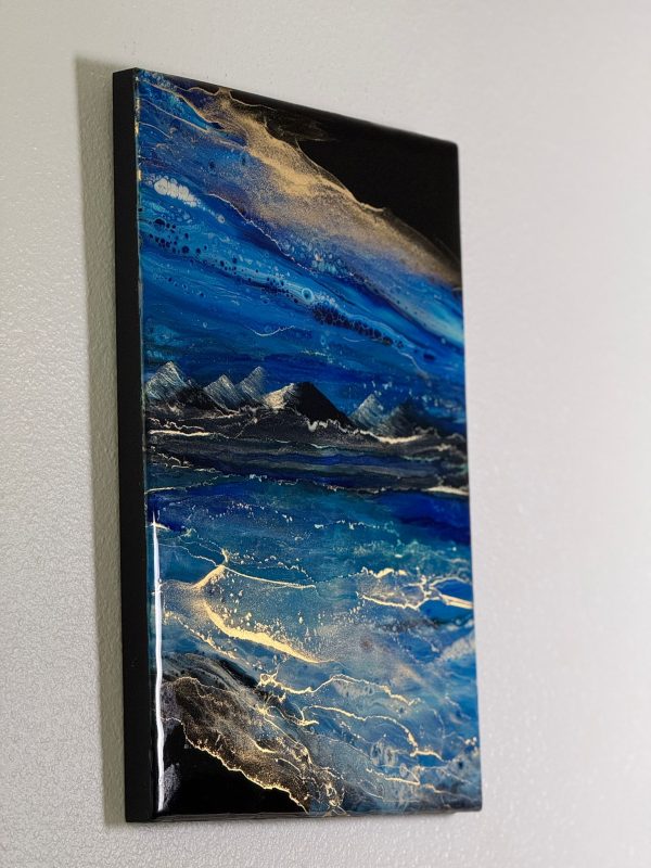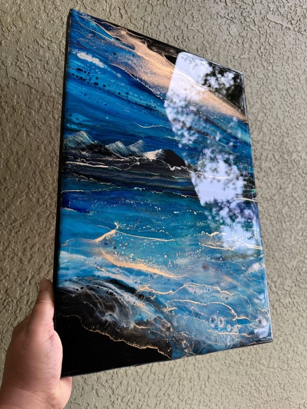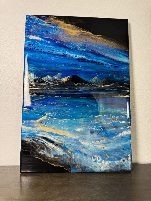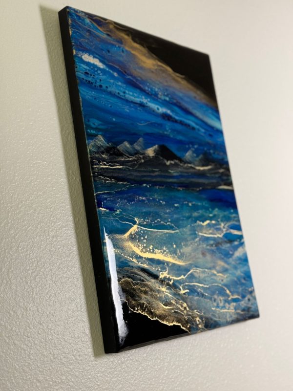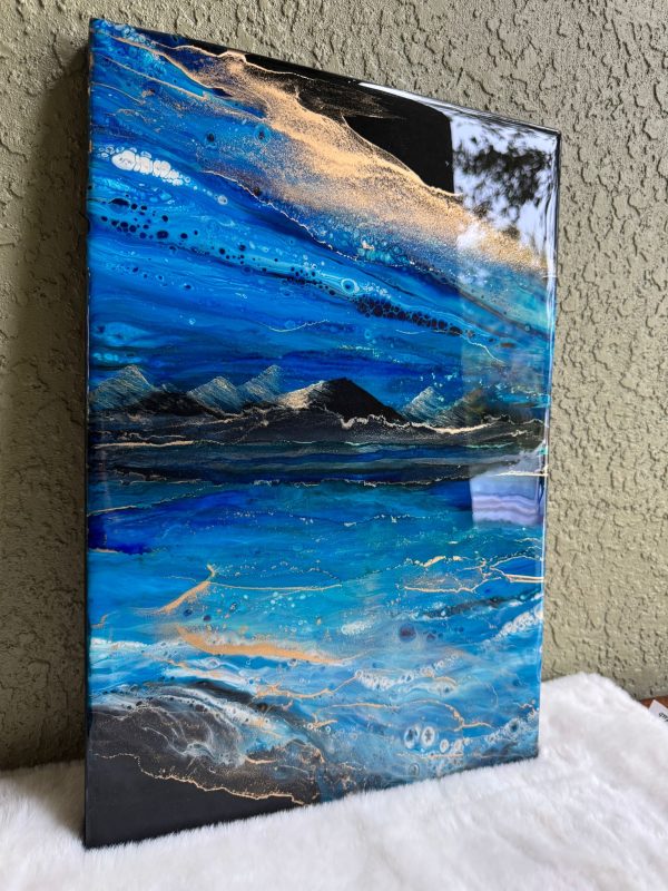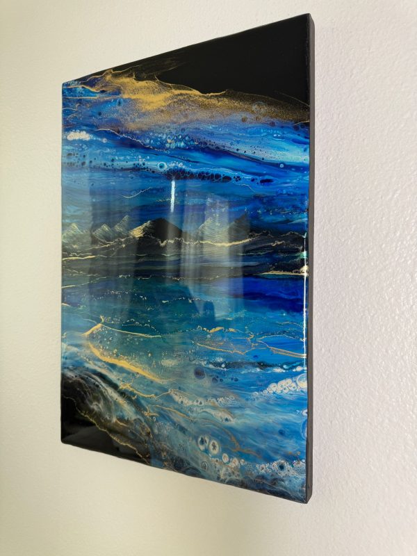 Golden rays washing over the ocean reflecting the sky at nightfall. The abstract details are achieved through a special art technique using Resin and has been further enhanced with Alcohol Inks to create depth. A final layer of clear resin gives it the perfect finish and shine