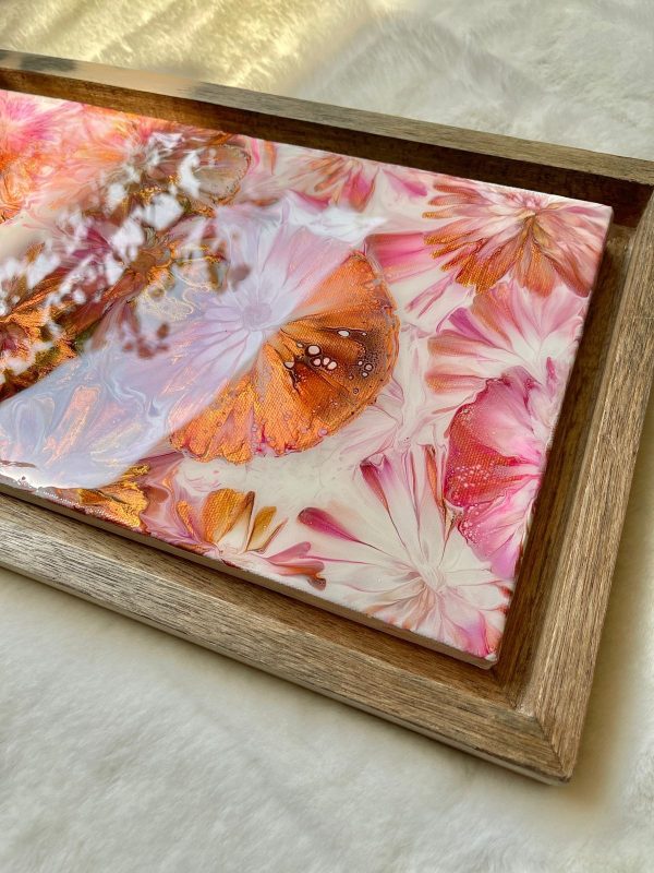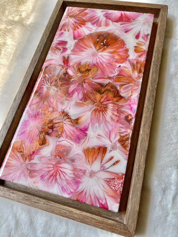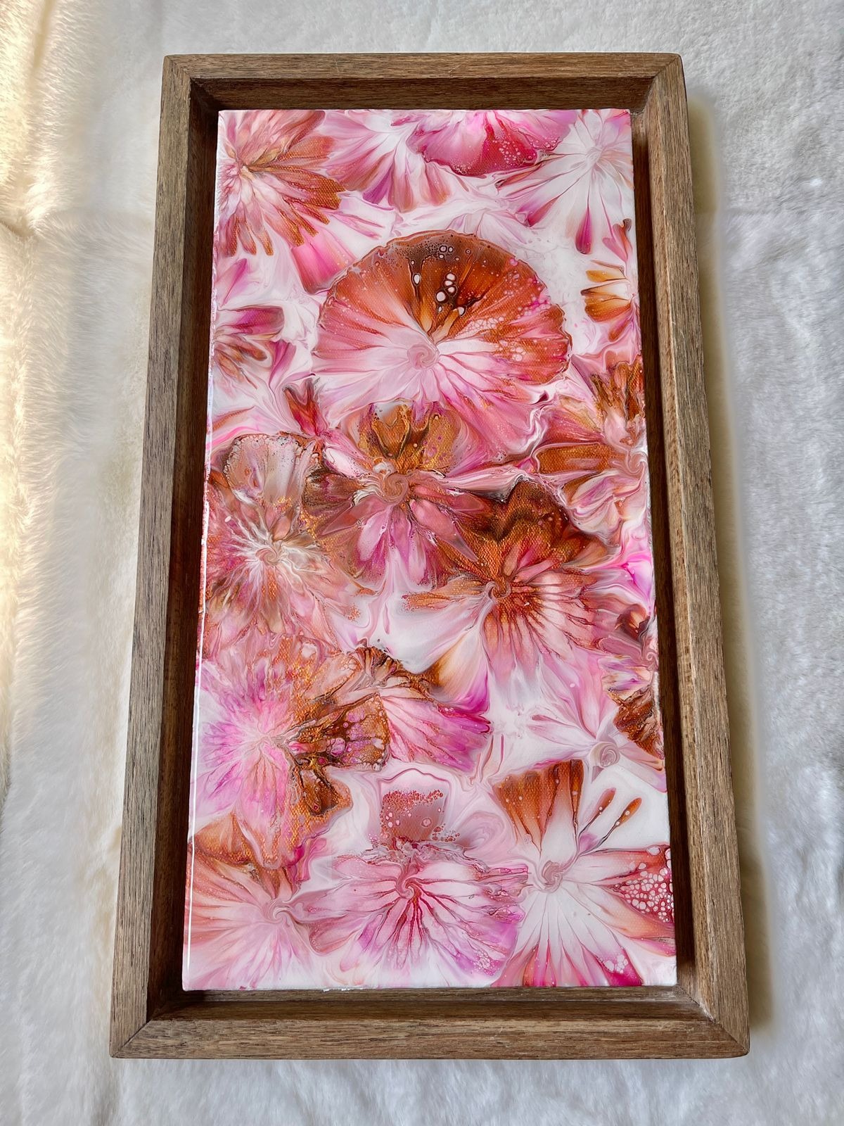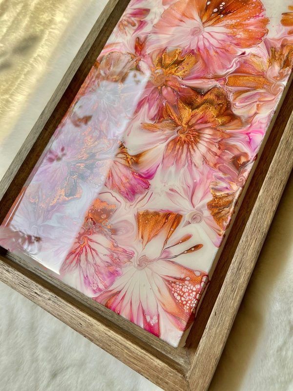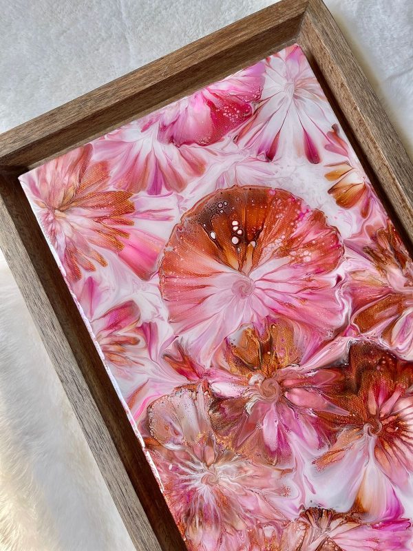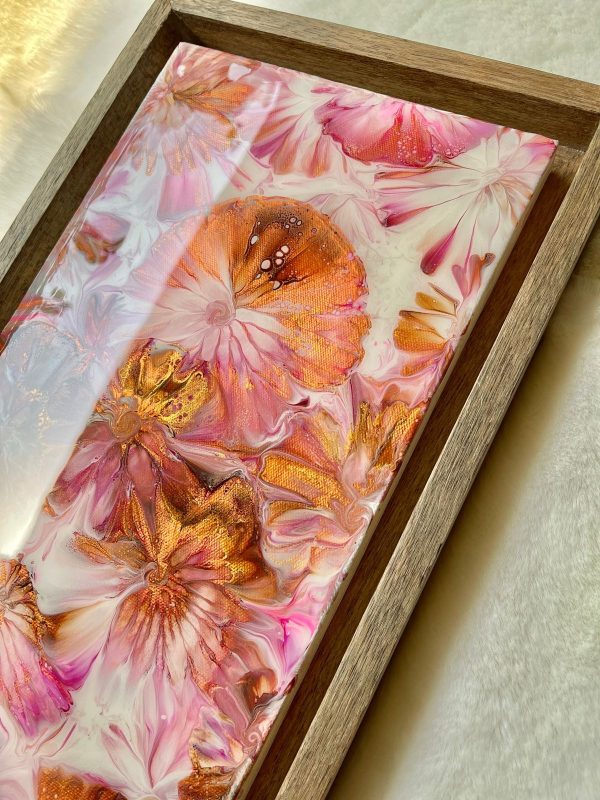 This acrylic wall art on a stretched canvas has a unique abstract design of field of flowers in shades of pink, copper gold and white. The details are achieved through a special art technique and has been finished with epoxy resin for an unbelievable gloss. The piece is also framed in a floater frame design made of solid wood.