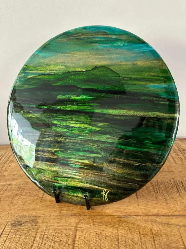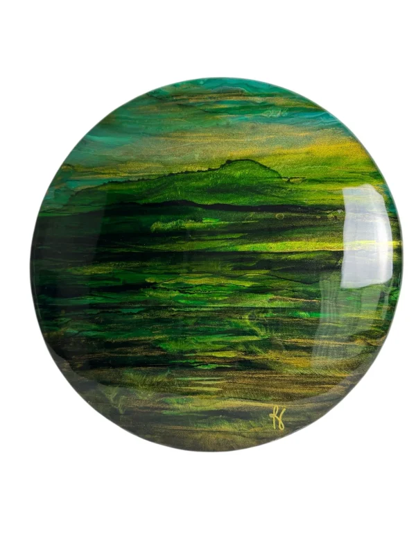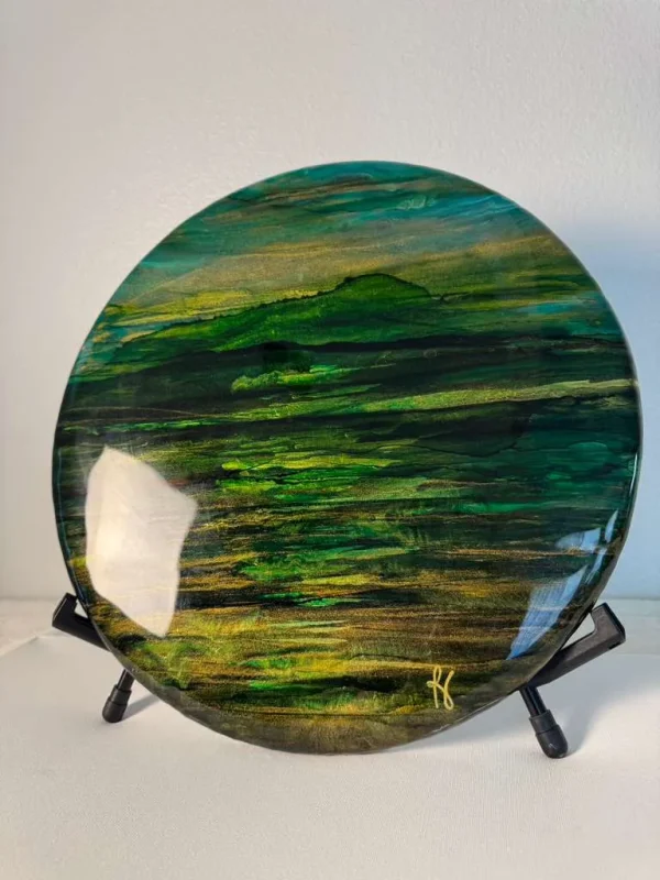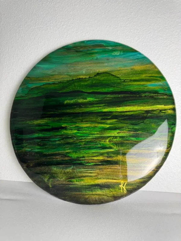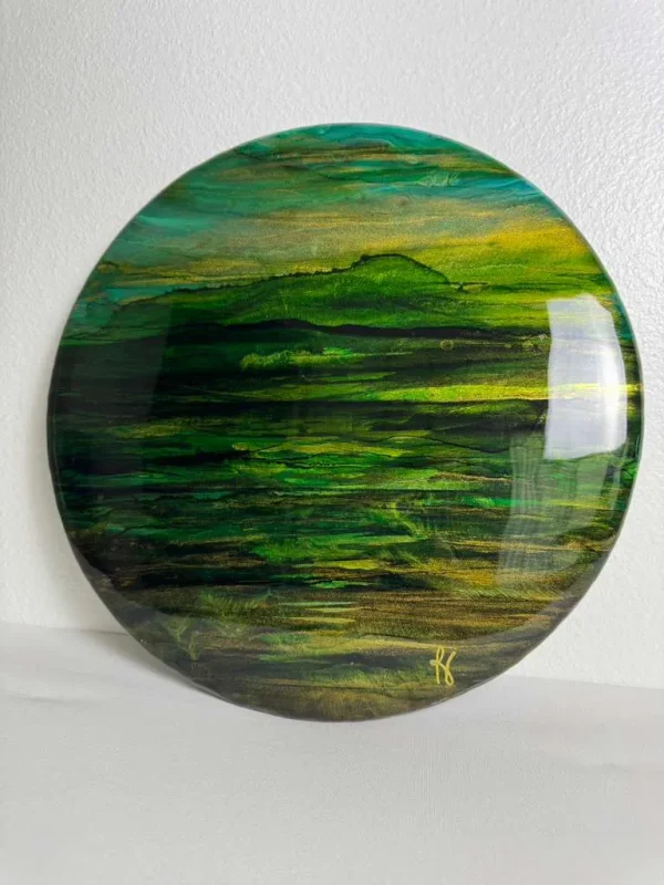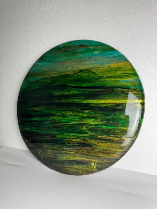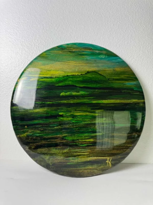 By layering resin and alcohol inks, depth and detail is created that draws the eyes endlessly. The high gloss resin finish is contemporary and in alignment with art that is forward looking.